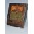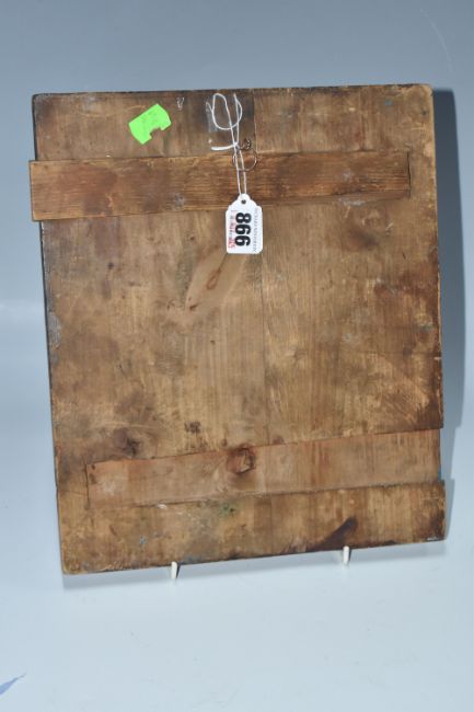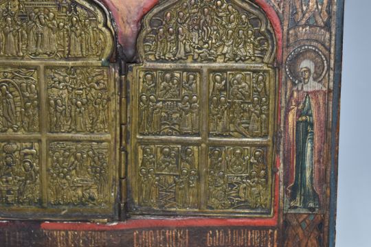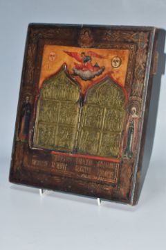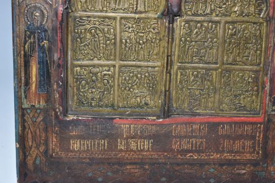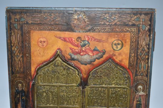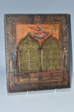 AN ORTHODOX 'BRASS INLAY' ICON, nineteenth century Russian school, with a folding brass panel inset into the main icon decorated with motifs and an ornate border, one back slat present, height 31cm x width 26cm (1) (Condition Report: some loss to the wood around the edges and the edge of the inlay, some crazing, some loss to the tempera around edges)