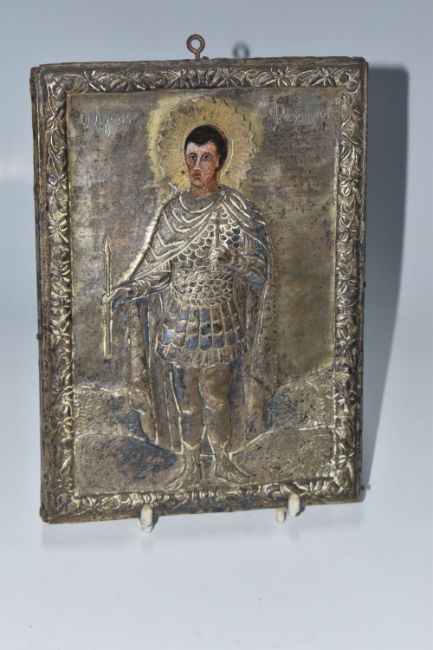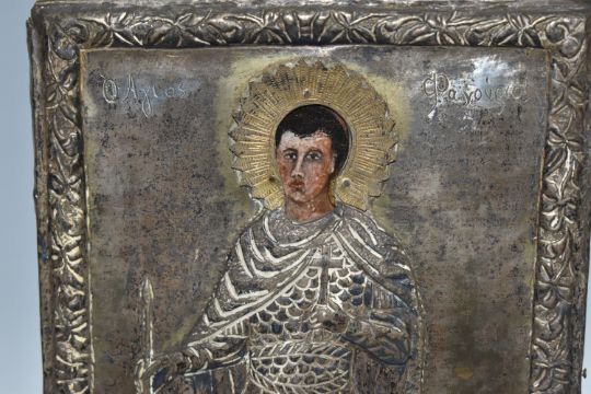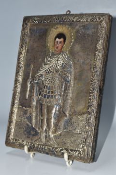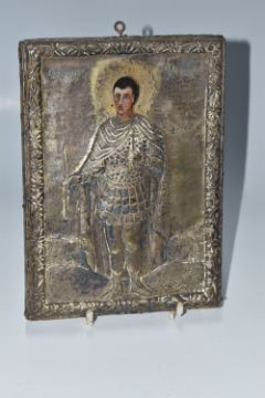 A GREEK ORTHODOX 'ST PHANOURIOS' OKLAD MOUNTED ICON depicting the youthful martyr St Phanourios 'the early revealed' clad in armour, height 12.5cm x width 16.5cm, oil on wood panel (1) (Condition Report: tarnish to the oklad, some knocks to the metal)