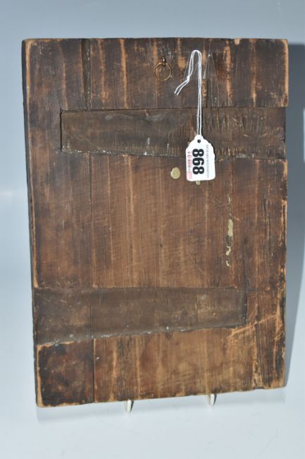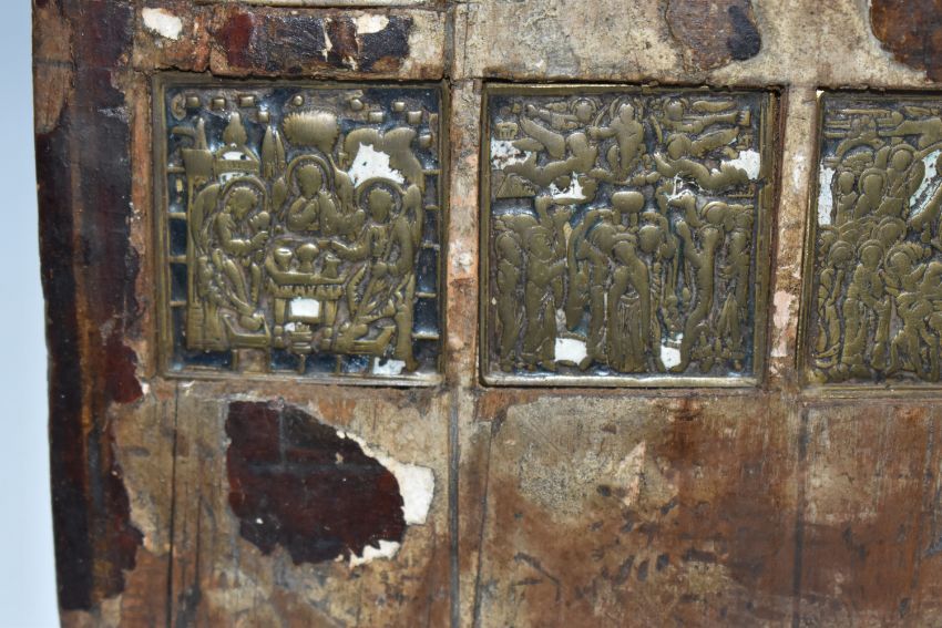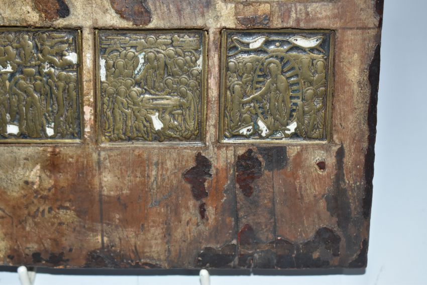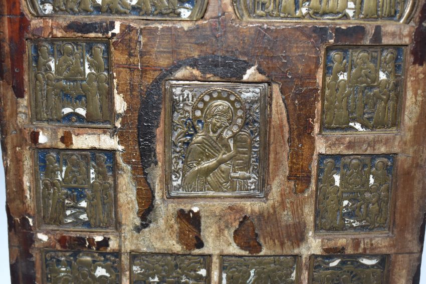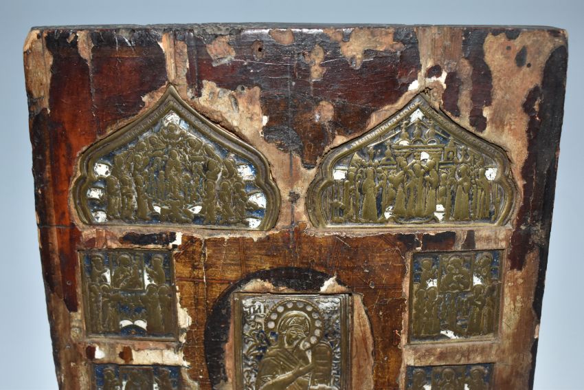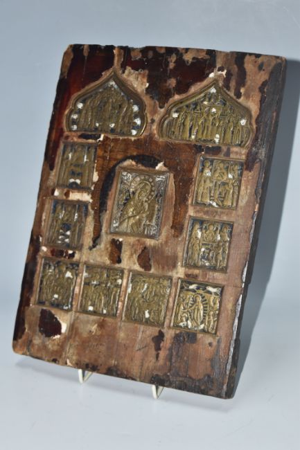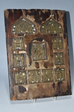 AN ORTHODOX 'INLAID VITA THEOKOTIS ' ICON with eleven brass panels inset into a wooden base with trace amounts of enamel present, a central figure of the holy mother surrounded by various scenes of her life height 30cm x width 22cm (1) (Condition Report: extensive loss to the icons image/tempera, both back slats missing, a/f)