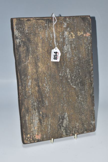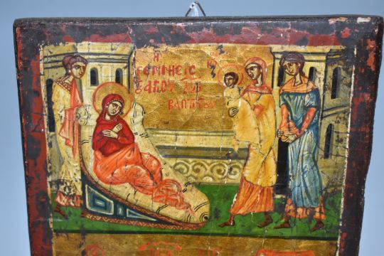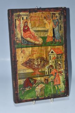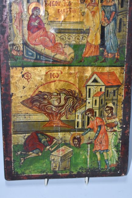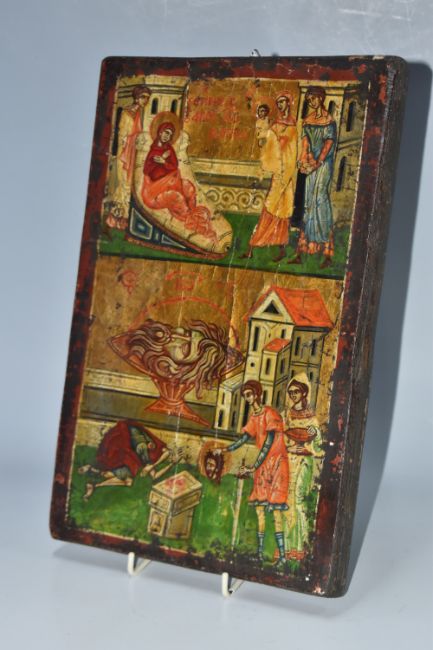 A 'BIRTH AND MARTYRDOM OF ST JOHN THE BAPTIST' ICON oil on wood panel with heavy gilding, in two panels depicting the birth of St John, and a larger panel depicting the decapitation of St John, and the presentation of his head to Salome, height 32.5cm x width 21cm (1) (Condition Report: heavy crazing to the image, chips and wear to the edges, crack visible)