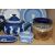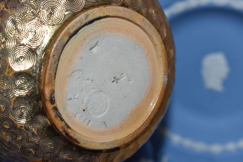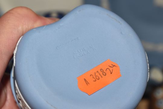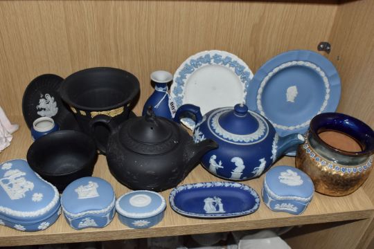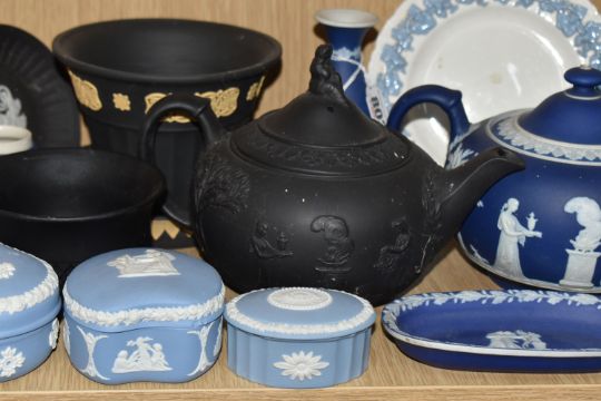 A GROUP OF WEDGWOOD JASPERWARE AND SIMILAR CERAMICS, comprising a Wedgwood black basalt teapot, a Wedgwood Jasperware black and cane Opus planter and tray, a blue dipped teapot (af, sd, restored) and bud vase, four pale blue trinket boxes (one with chipped cover), a pale blue plate (possibly second quality) and shallow dish, a black trinket dish, and an embossed Queens Ware side plate, together with an Adams blue dipped vase, an unmarked blue dipped tray, and a Royal Doulton Slaters Patent vase/planter (one sprigged flower missing part of a petal), together with a deep purple pressed glass bowl (tiny chips) (17) (Condition Report: most pieces appear ok, obvious specific damage as stated, would benefit from a clean)