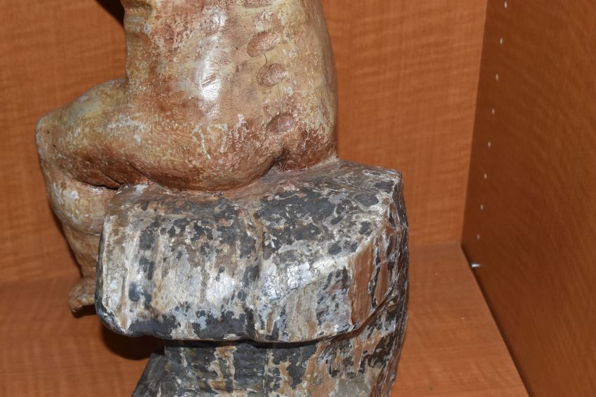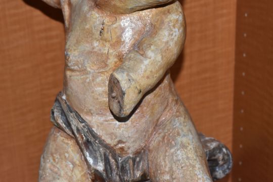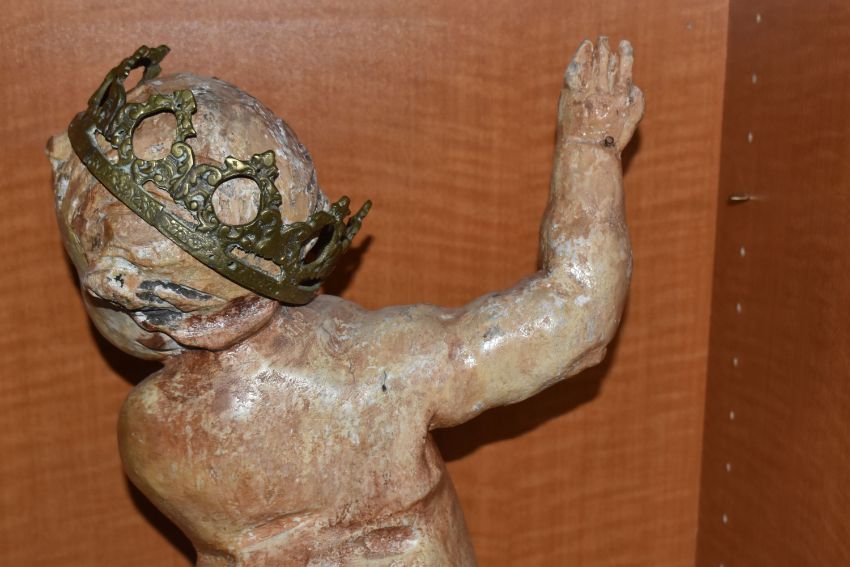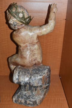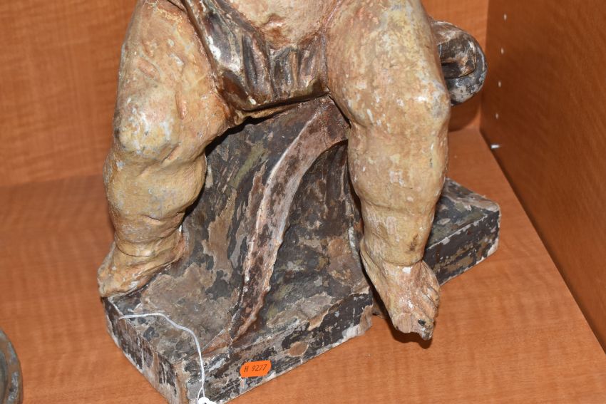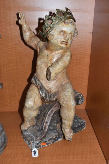 A LARGE POLYCHROME WOODEN SCULPTURE OF A CHILD sat on a carved crested wave, height 55cm x width 29cm (1) (Condition Report: extensive loss to the paintwork, loss to an arm, fingers and toes, cracks in various locations, signs of repair, a.f)