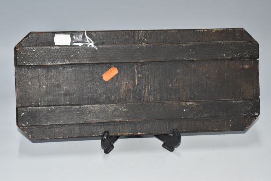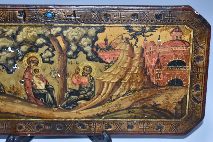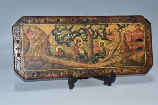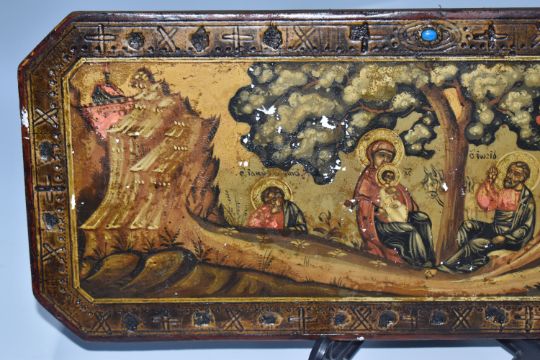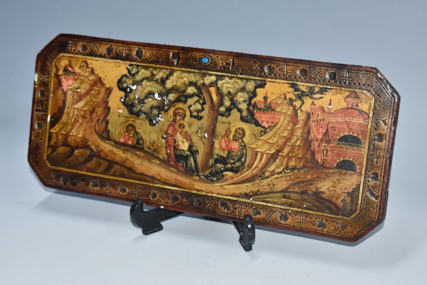A RECTANGULAR ICON with cut corners depicting the Virgin Mary and Jesus beneath a tree with an additional saint, a black demon flies towards the city, an etched border with alternating crosses (some losses), a blue stone within an abstracted eye motif, two horizontal back slats, height 16cm x width 38cm (1) (Condition Report: some loss to the main scene)