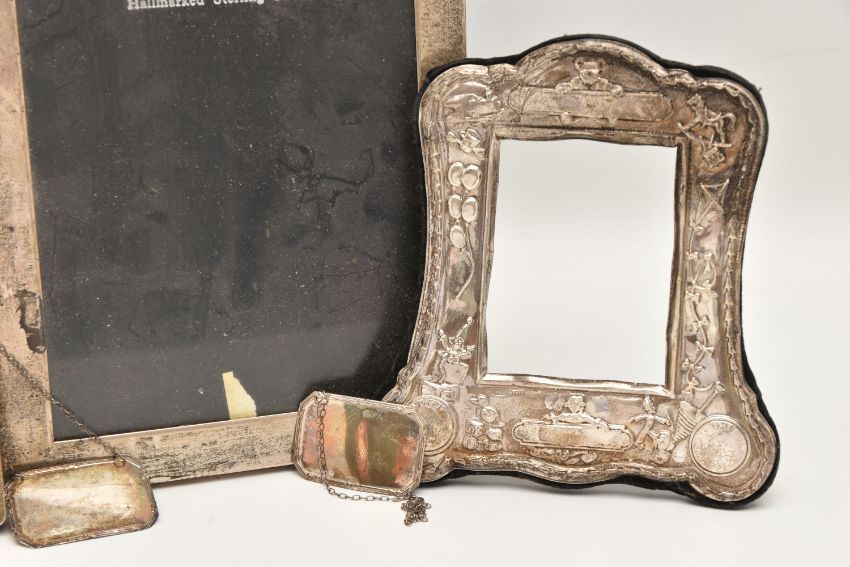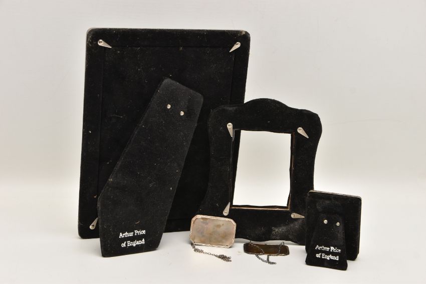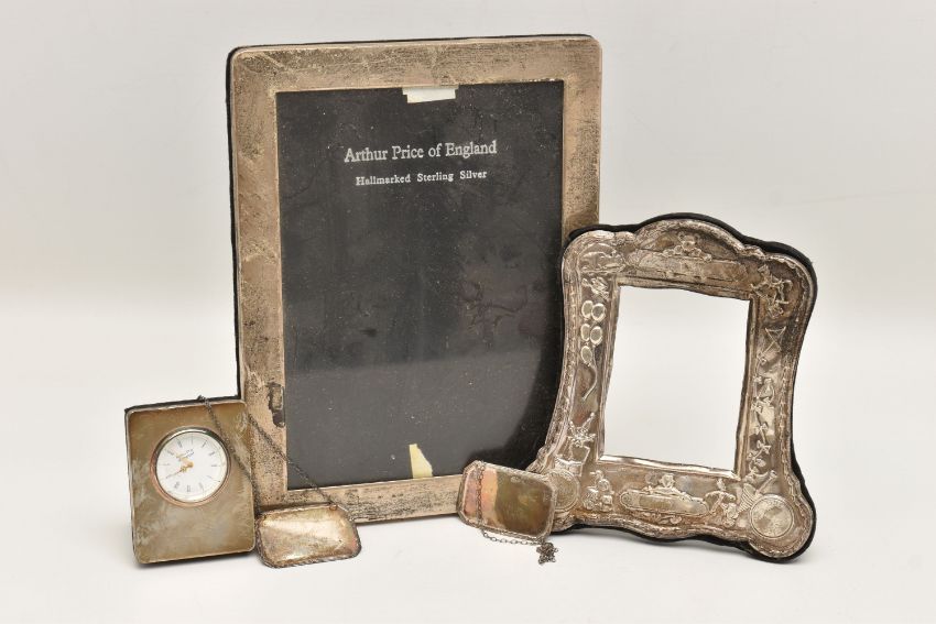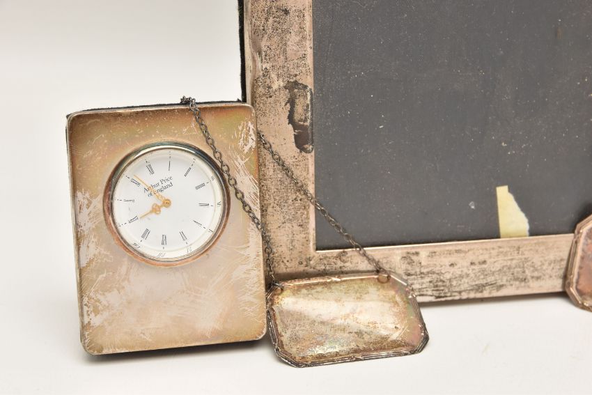 A SMALL ASSORTMENT OF SILVER, to include a polished rectangular silver photo frame, hallmarked 'Arthur Price Of England' London, measuring approximately length 21.5cm x width 16.5cm, a smaller embossed AF silver photo frame, hallmarked London, a boxed small silver 'Arthur Price of England' mantle clock hallmarked London, two silver polished decanter labels both hallmarked London broken chains, approximate gross weight of decanter labels 10.0 grams