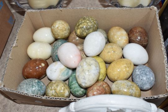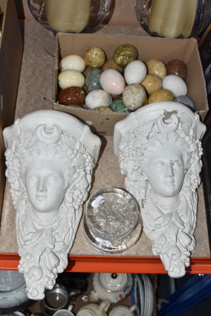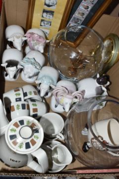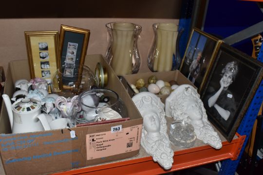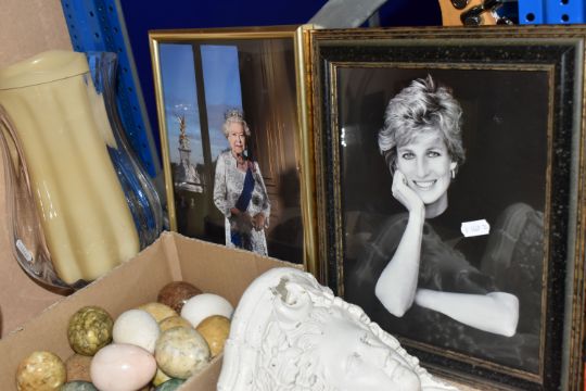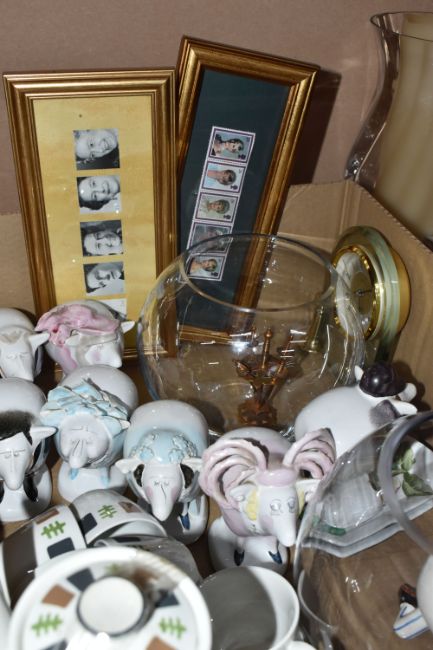 TWO BOXES AND LOOSE MISCELLANEOUS CERAMICS AND GLASS, to include seven Carlton Ware, Malcolm Gooding, 1984, sheep figurines in characters of mostly the Royal family, included, Queen Mother, The late Queen Elizabeth, Prince Phillip, Prince/King Charles, Princess Diana, Princess Anne and Barbra Cartland, also a silver jubilee novelty mug, framed Royal memorabilia, a T. G. Green 'Gresley Nordic' coffee set, approximately twenty precious stones in the form of egg shaped, two large glass vases with battery candles, and decorative moulded plaster brackets in the form of a women's face, (2 boxes + loose), (sd/af)