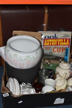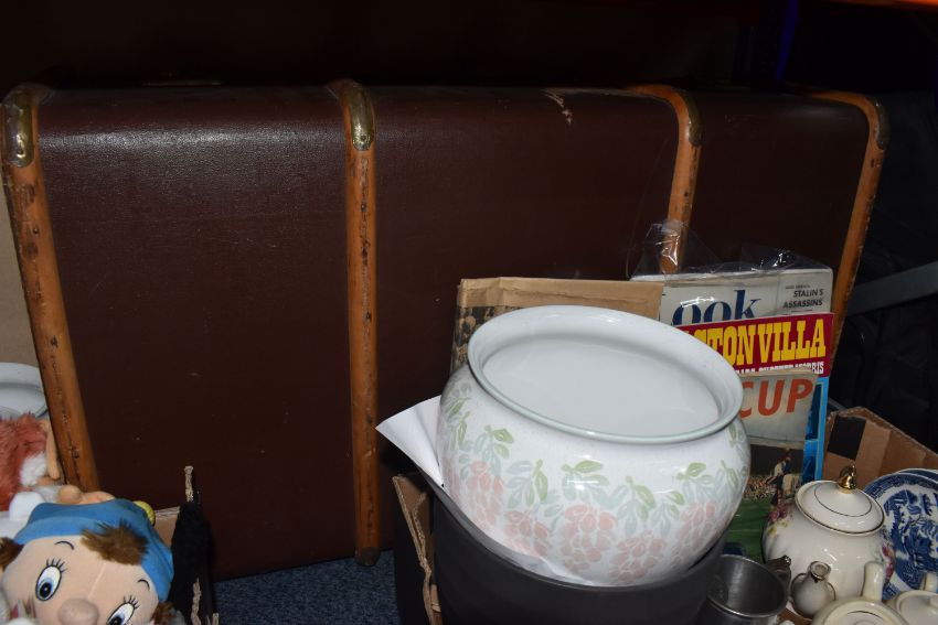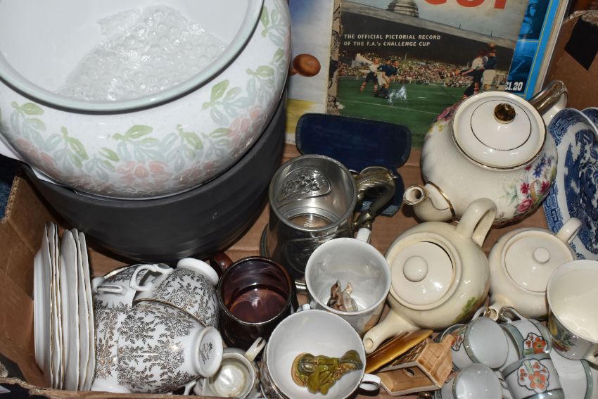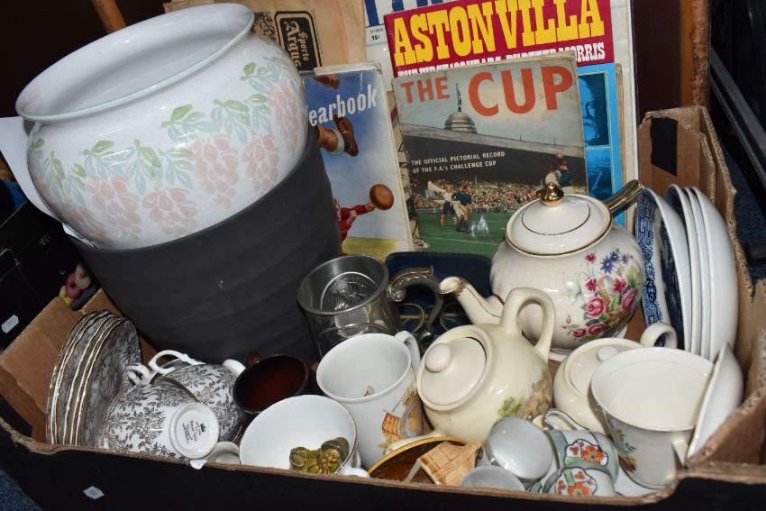 ONE BOX AND LOOSE MISCELLANEOUS, to include a large trunk, planters, teapots, and tea ware, to include Royal Vale plates, cups and saucers, Wedgwood 'Willow', two Wade whimsies, a pair of round vintage glasses made by C. Davis Keeler Ltd in the original case, and football ephemera (1 box + loose), (sd/af)