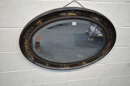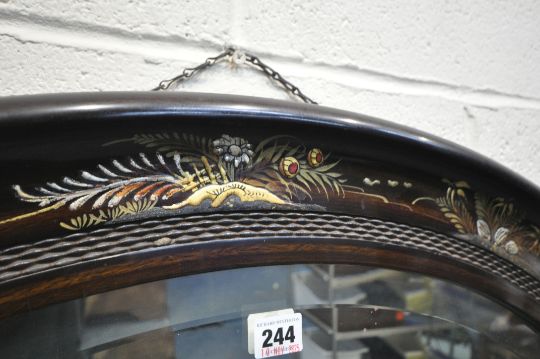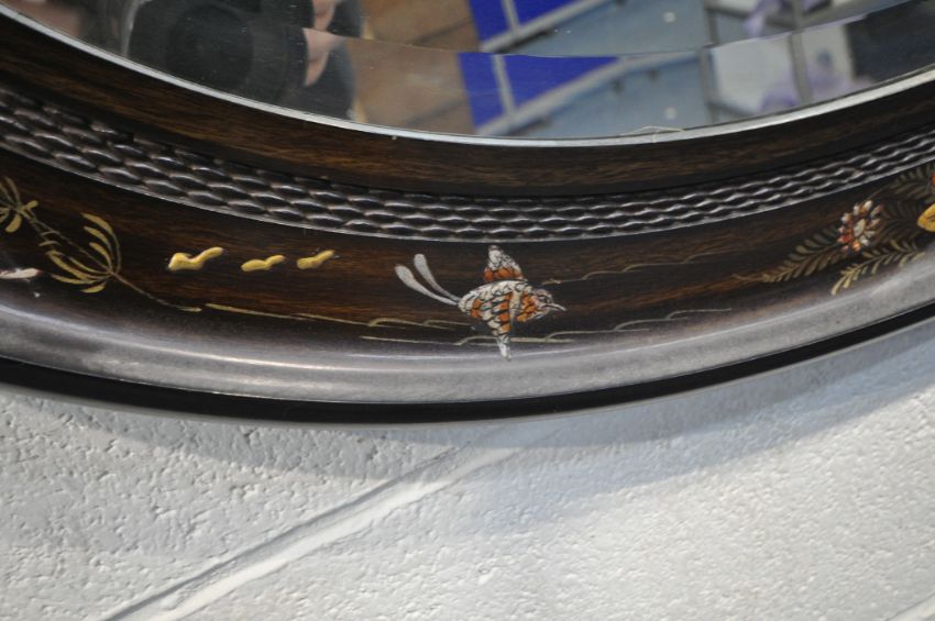AN OVAL ORIENTAL MIRROR, with chinoiserie details, and a bevelled mirror plate, width 91cm x height 65cm, condition report: no visible damage