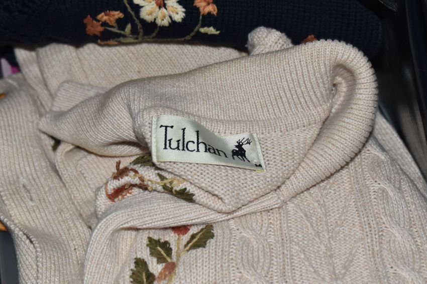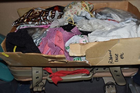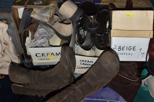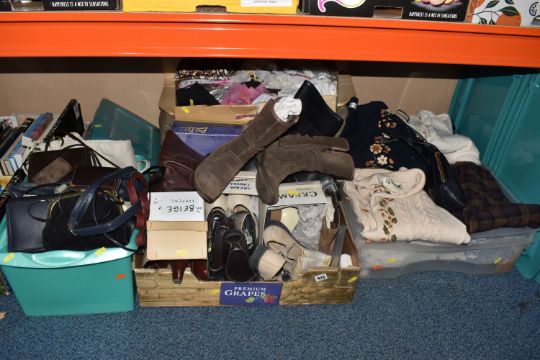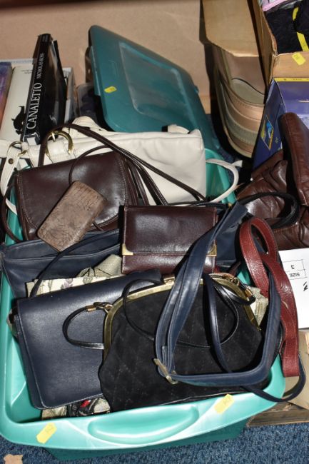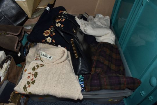 SIX BOXES AND LOOSE OF LADIES VINTAGE CLOTHES AND ACCESSORIES, to include handbags, gloves, silk scarves, shoes and boots, girdles 25-26 inch waist, nightgowns, skirts, knitwear, etc. sizes approximately 14-16, 16-18 in clothes, shoe size 3 and 4, some names include M&S, Cotswold Company, Tulchan, Jumper, etc. also included an antler small travel case, (6 boxes + loose), (sd/af)