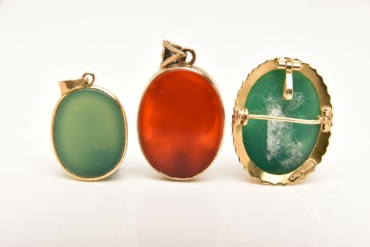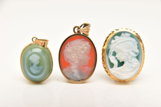 THREE AGATE CAMEOS, the first an oval form pendant, collet set in yellow gold, approximate length including bail 28mm, hallmarked 9ct Birmingham, approximate gross weight 2.5 grams, a raised cameo collet set in yellow metal, approximate length including bail 23mm, stamped 750, approximate gross weight 2 grams, together with an Italian cameo pendant brooch, collet set in yellow metal, approximate length excluding bail 23mm, stamped 750, approximate gross weight 2.9 grams, (condition report: general light wear, overall condition good)
