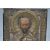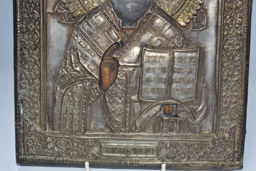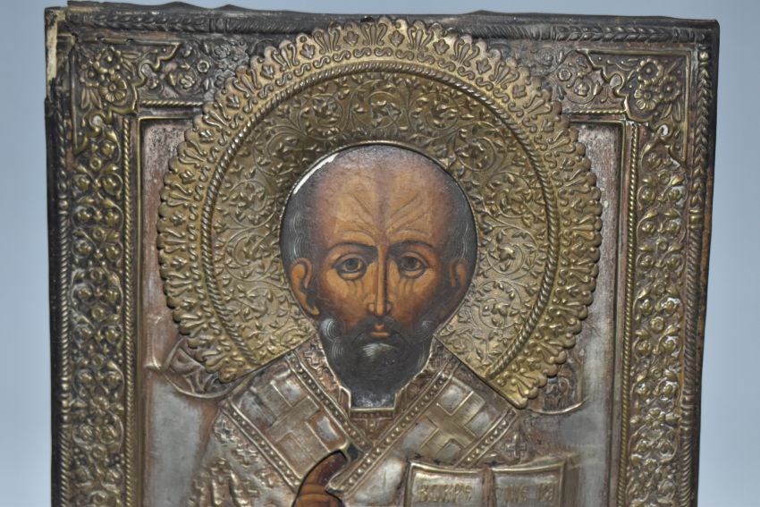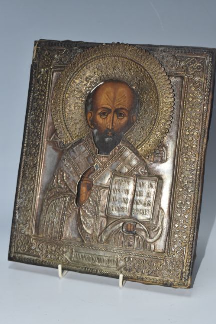 AN ORTHODOX 'SAINT NICHOLAS OF MYRA' ICON with oklad attached, depicting the saint with an elevated halo, height 26cm x width 22cm, two back slats in place beneath the lining on the reverse (1) (Condition Report: some loss on the corner of the oklad, chip to the paintwork of the icon, the underneath unchecked)