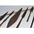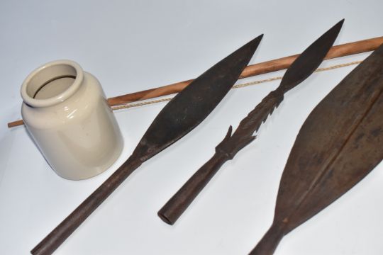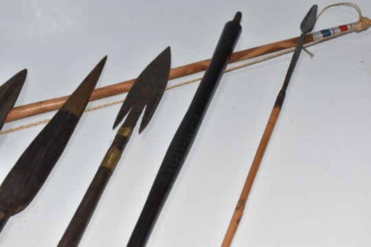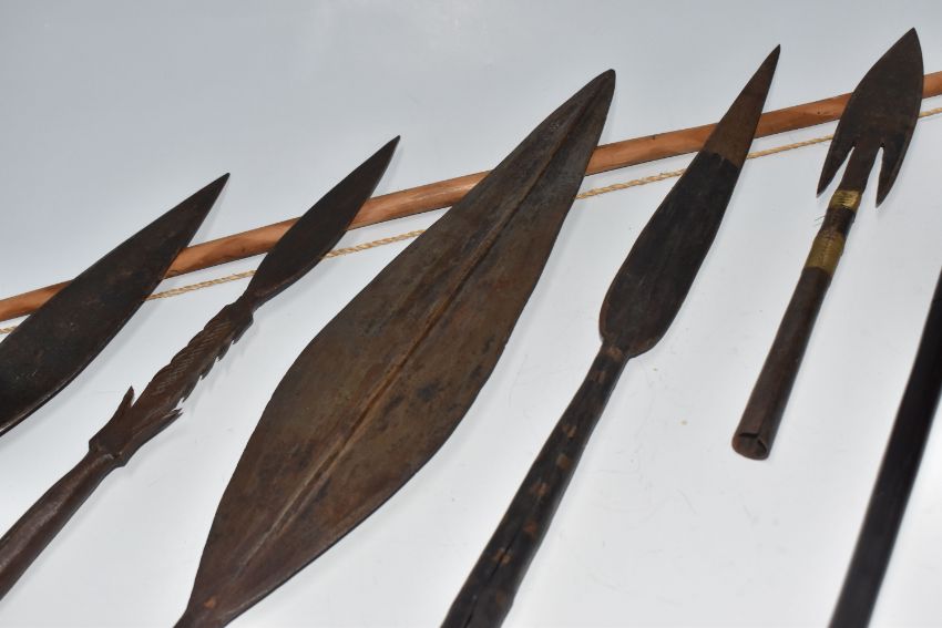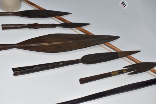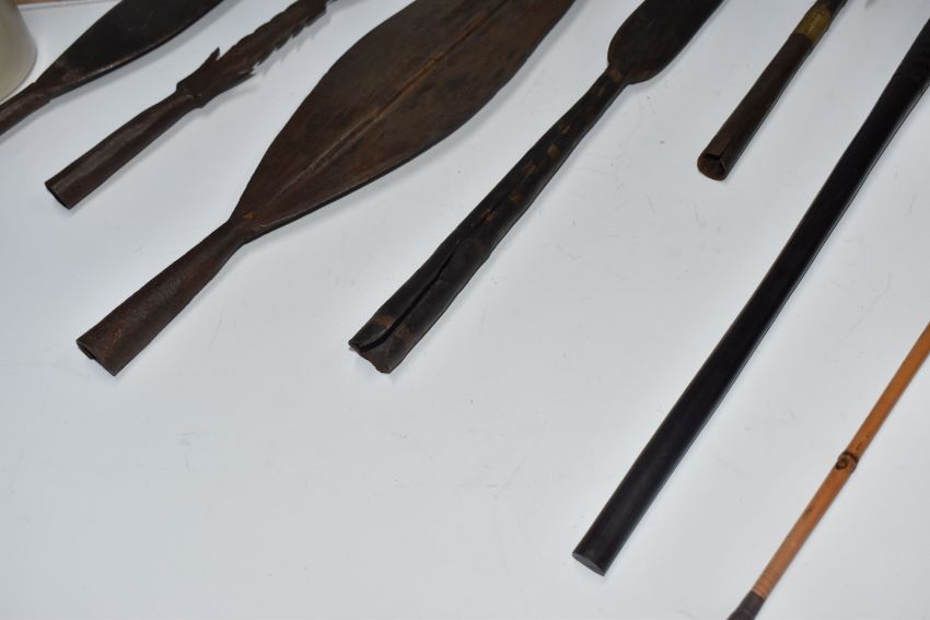 A COLLECTION OF AFRICAN TRIBAL INTREST ITEMS, to include five african spear heads, some featuring the distinctive leaf shape, a fishing barbed spear head, etc. length of largest 45cm, together with a traditional bow and arrow, (1 box), (sd/af)