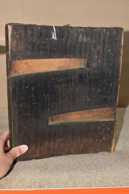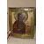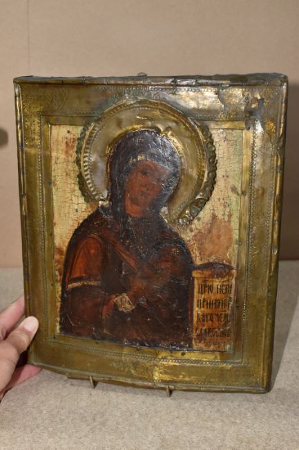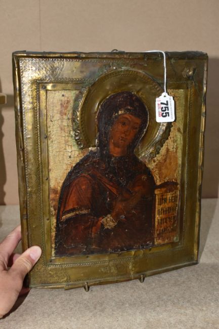 AN ORTHODOX 'VIRGIN MARY' ICON, nineteenth century of the Russian School with a partial brass oklad to the edges and halo, height 31cm x width 26cm (1) (Condition Report: no back slats present, some losses and high degree of cracks, some curvature, loss to the brass in places, signs of historic woodworm and repair)