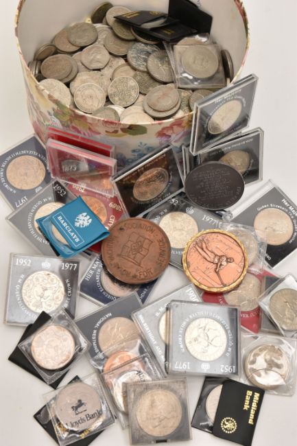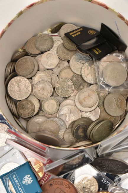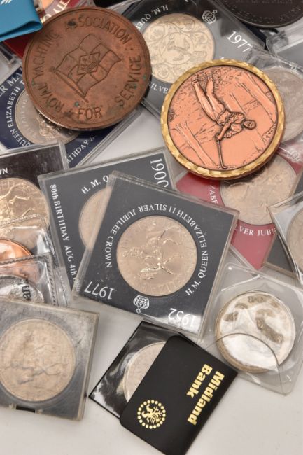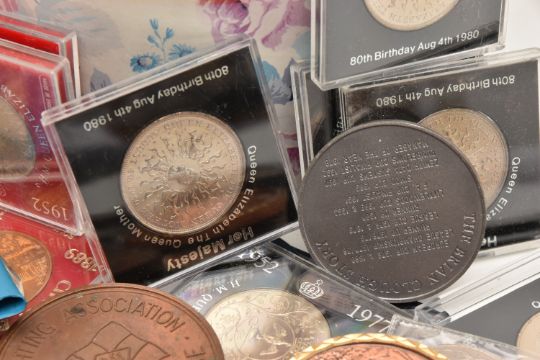 A ROUND CARDBOARD BOX OF MAINLY UK COMMEMORATIVES, to include a 1953 Bronze Commemorative Medallion for Queen Elizabeths Coronation 1953, a Golfing and other award, etc