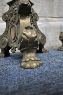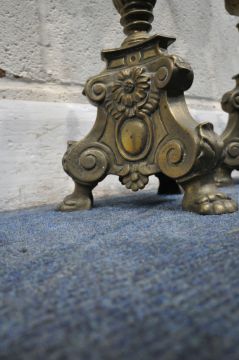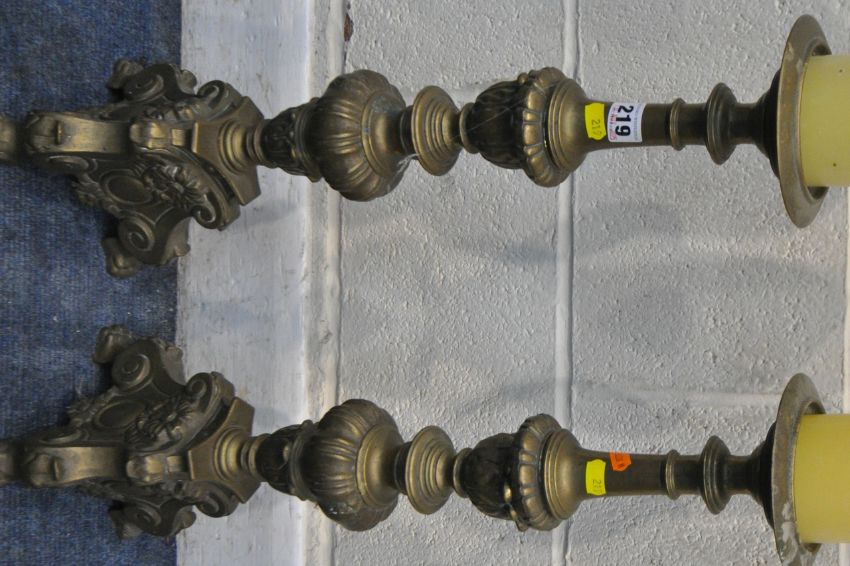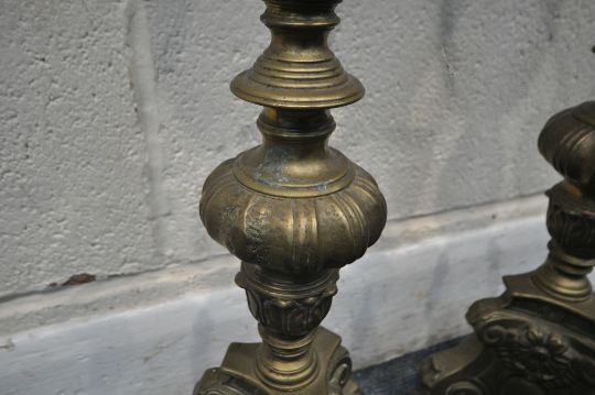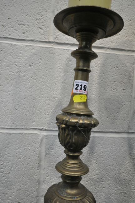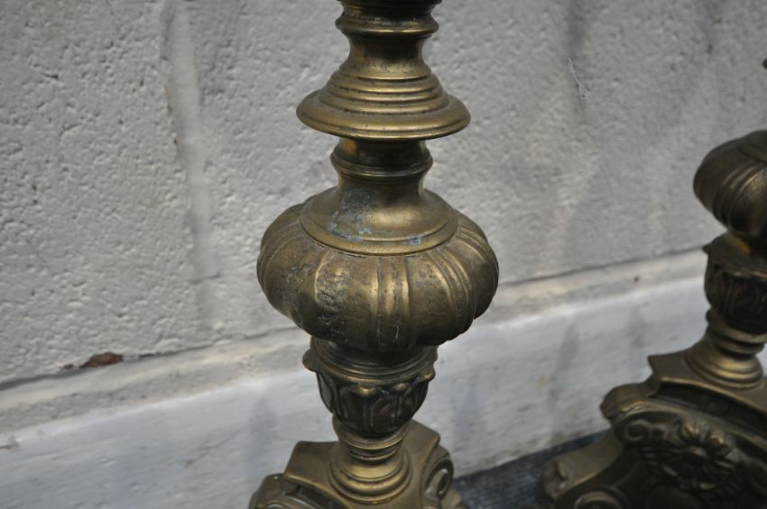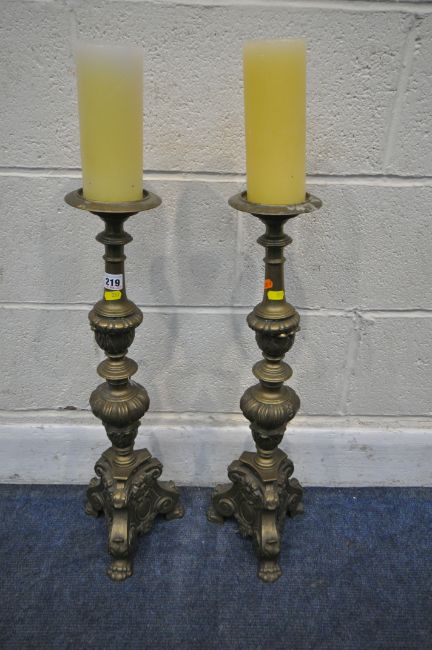 A PAIR OF BRASS ECCLESIASTICAL ALTAR CANDLE STICKS, with bulbous, scrolled and foliate designs, raised on three paw feet, height 63cm, condition report: two candles present, general signs of wear, usage and patina, slightly wonky but can be re-aligned (2)