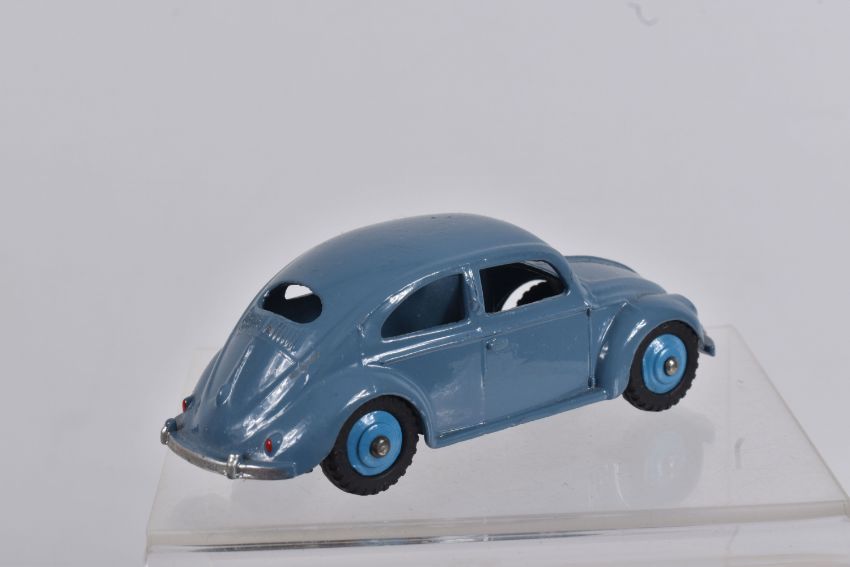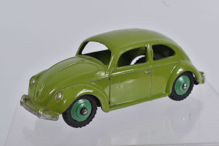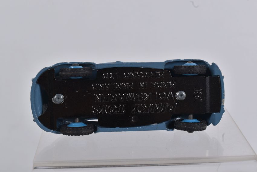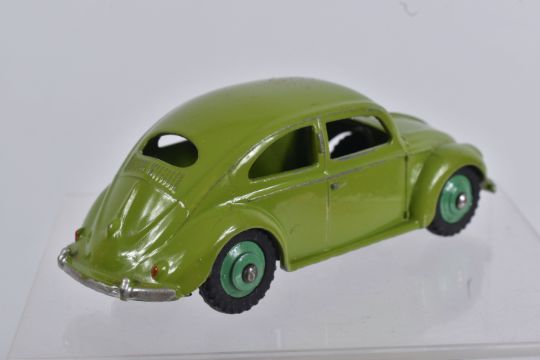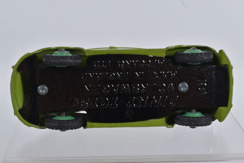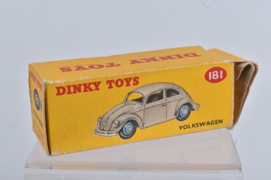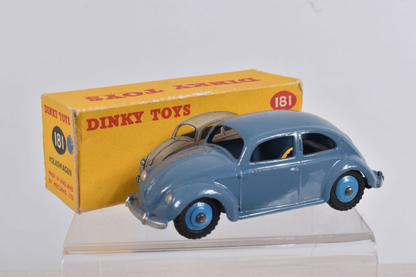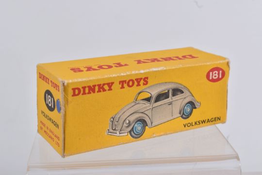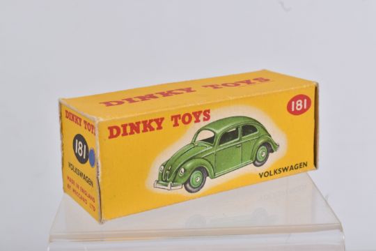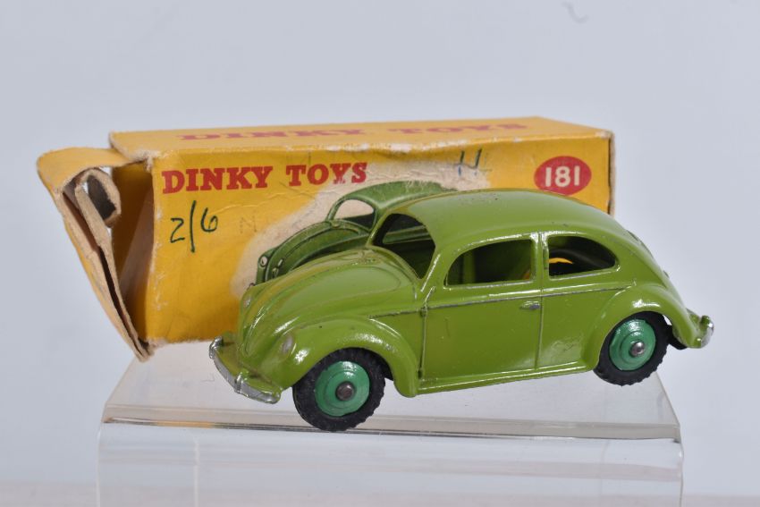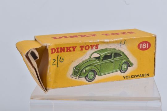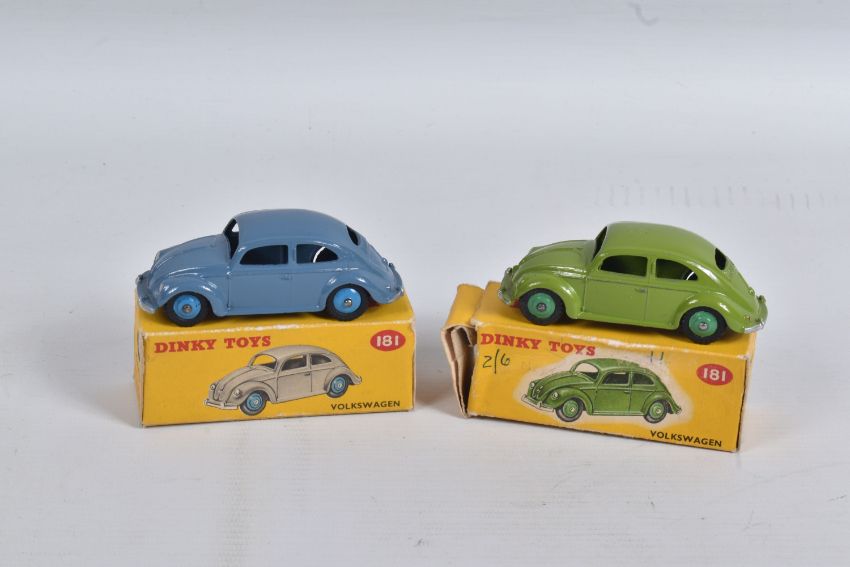 TWO DINKY TOYS DIECAST VOLKSWAGEN SALOON MODELS, no. 181, the first a RAF greyish blue body with mid blue hubs, unpainted base, silvered detail, very little to no wear, box with blue sticker in good condition, the second a lime green body with mid green hubs, wear to raised edges, box a little more worn with pen mark to various panels and green marker to end, possible restorations
