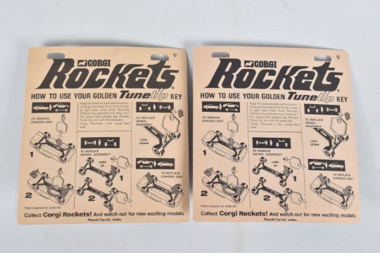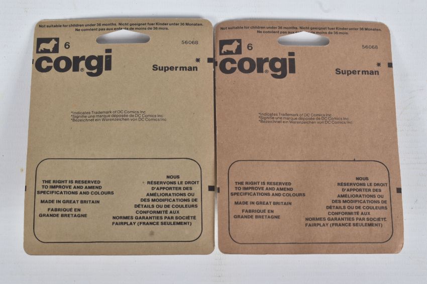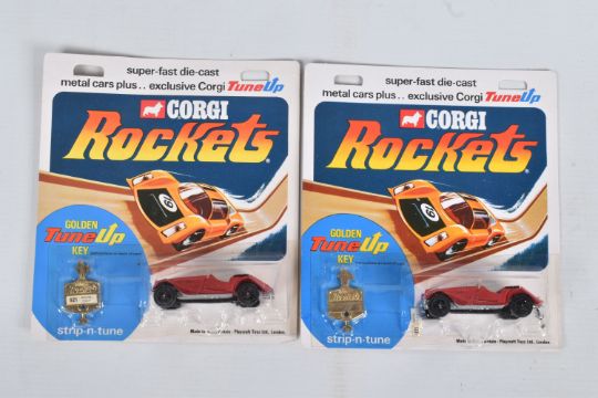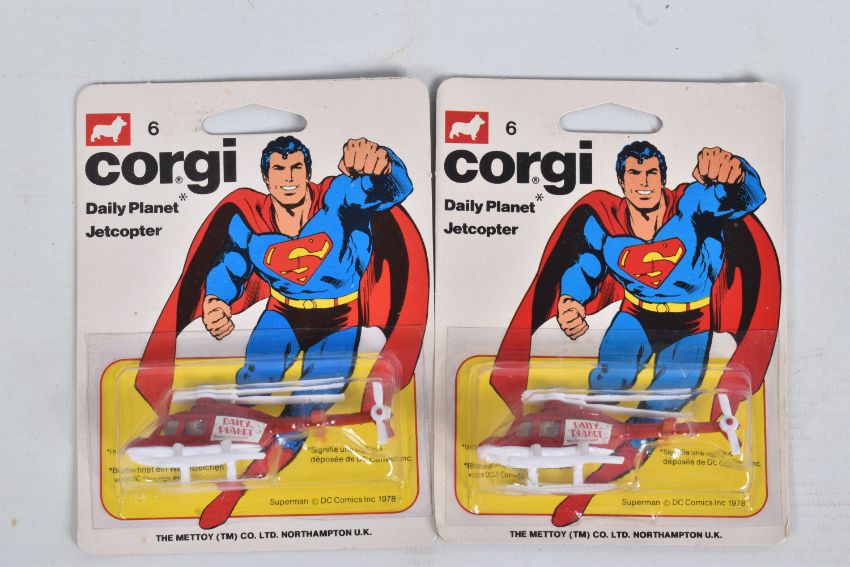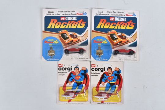 FOUR VINTAGE CORGI DIECAST MODELS IN SEALED BLISTER PACKS, to include two Corgi Juniors Daily Planet Jetcopter 'Superman' in red and white no. 6 and two Exclusive Corgi Rockets Golden Key TuneUp Morgan Plus 8 in red comes with a TuneUp Key to keep Rockets at Peak Performance, no. 921, these are in factory sealed blister packs and are in very good condition