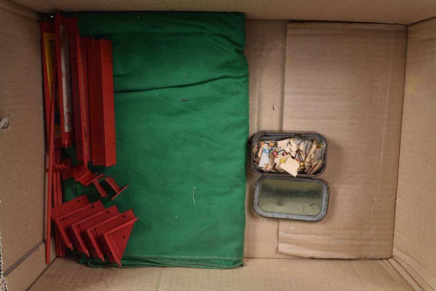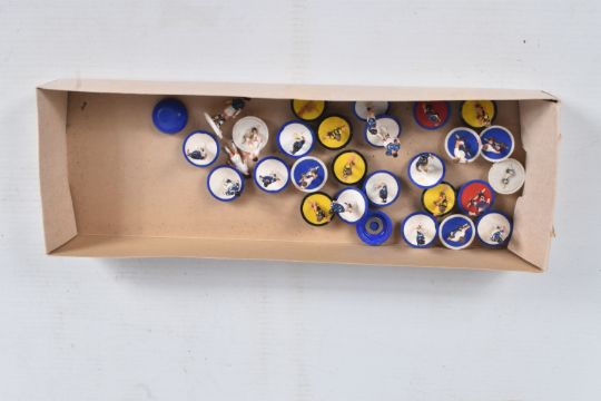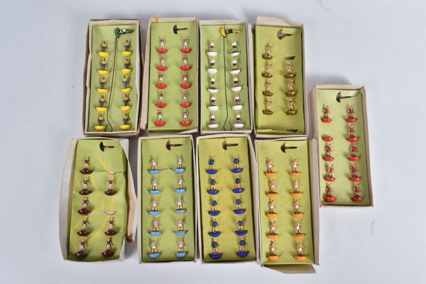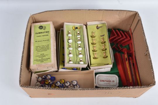 A QUANTITY OF ASSORTED SUBBUTEO ITEMS, to include a quantity of part boxed heavyweight teams and part teams, all in playworn condition, some look to have been broken off bases and re-glued, some missing arms, many with paint loss and wear, majority of teams missing goalkeeper, boxes with damage and wear, a quantity of assorted loose heavyweight players in the same condition, pitch and set of the earlier red fencing, with a tin containing Shoot League Ladders club tabs, fair condition, not checked for completeness, tabs only no ladders