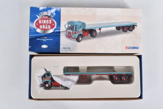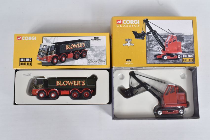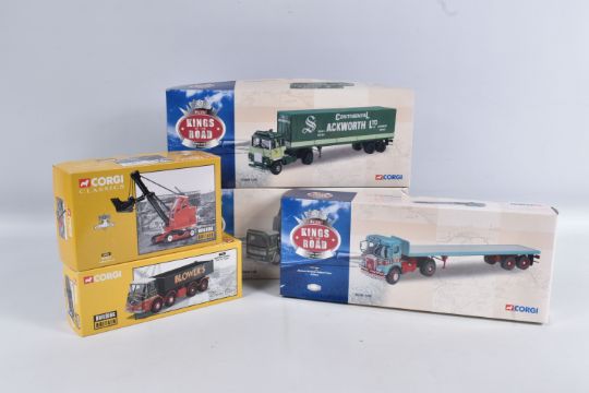 FIVE BOXED 1:50 AND 1:45 SCALE CORGI DIECAST MODEL BUILDING AND TRANSPORT VEHICLES, to include a Building Britain Blower Bros ERF KV Tipper 11701, a Building Britain Wimpy Luffing Shovel 30901 and three kings of the road models including a Atkinson Borderer Flatbed Trailer Pollock CC12504, AEC Ergo Sheeted Platform trailer Willmotts transport limited CC10301, Scammell Crusader tilt trailer C.R.T.S. (Ackworth)ltd CC12602, all models appear in good condition however contents has not been checked for their completion, housed inside their plastic casing and outer cardboard boxes, outer boxes are in good condition some wear to sharp edges and corners