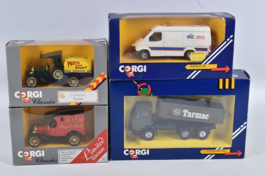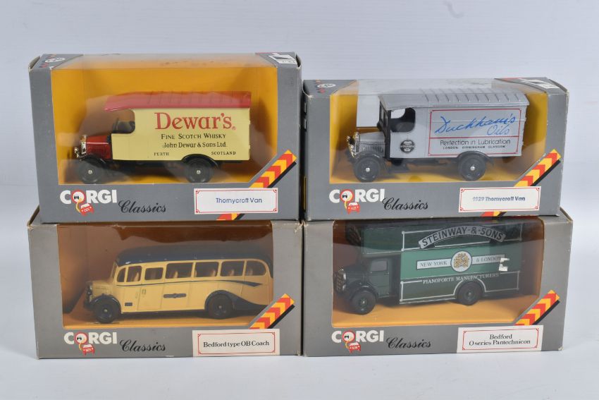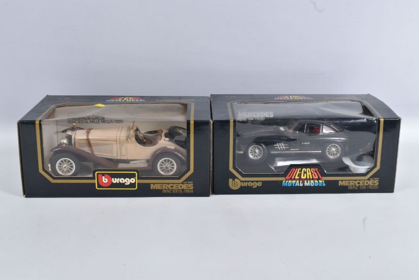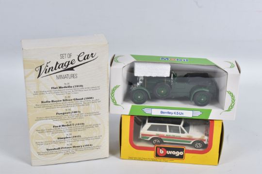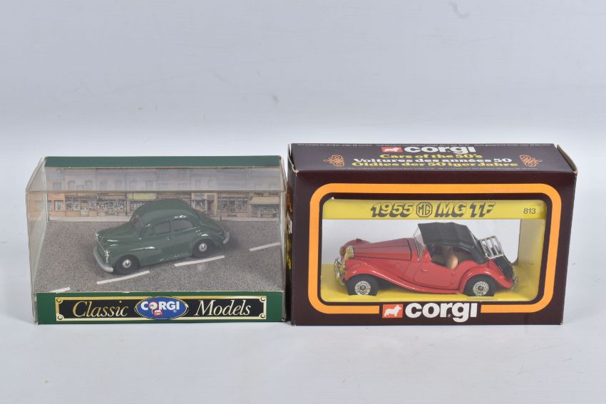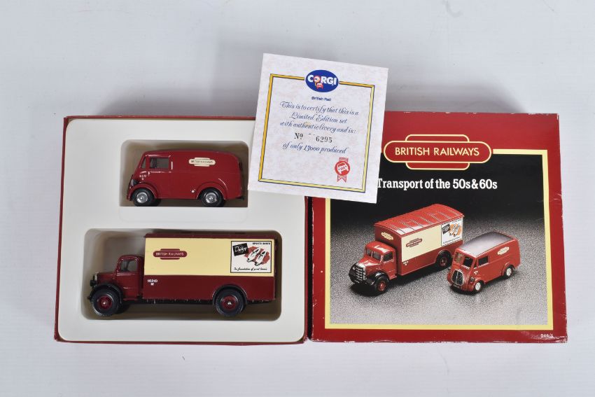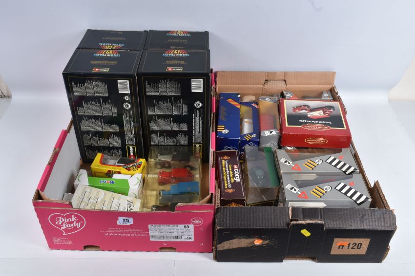 A QUANTITY OF BOXED DIECAST MODEL VEHICLES, to include models by Corgi Matchbox, Bburago and Solido along with a few promotional models, included in this lot are fifteen Corgi models, of which are ten 1:43 scale Corgi Classics model no.s 845, 819, C957/2, C814/1, 815, C913, C954/4 and C954/2, C864 and C877, a British Railways Transport of the 50s & 60s set no. D46/1, a Morris Minor Saloon no. D702, a MG TF no. 813, a Ford Transit Van no. C656/1, and a Mercedes Tipper no. 1128, there are four Solido Age d'or models in perspex display cases, and five Bburago models, a Range Rover no. 4156, a Mercedes Benz 300 SL no. 3015, a Ferrari Testa Rossa no. 3007, and a and a Mercedes Benz SSK no. 3009, along with similar models in this lot, contents have not been checked for completeness these all appear in good condition, the outer packaging showing slight signs of wear from storage and handling (2 boxes)