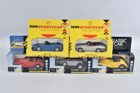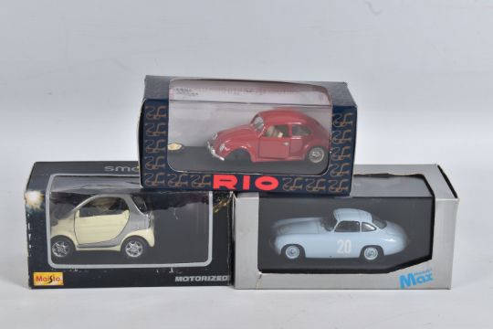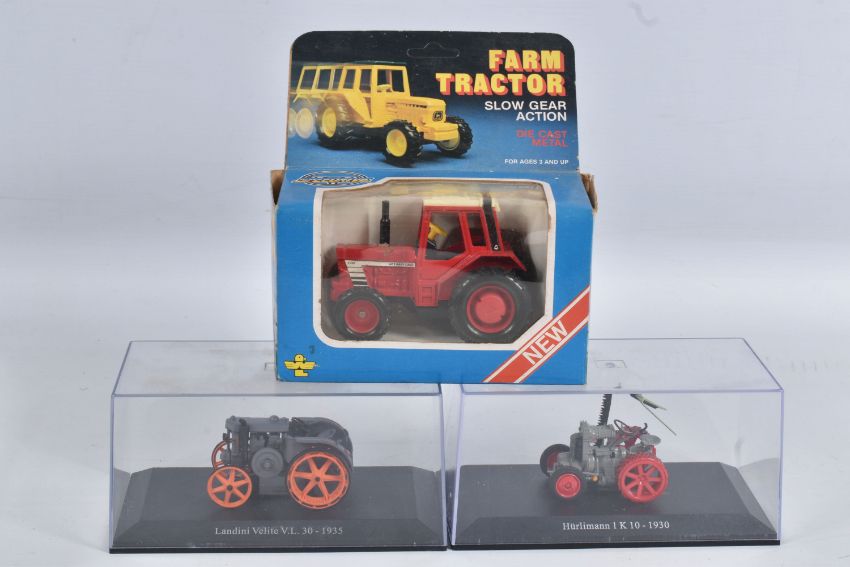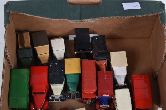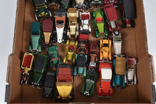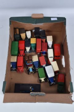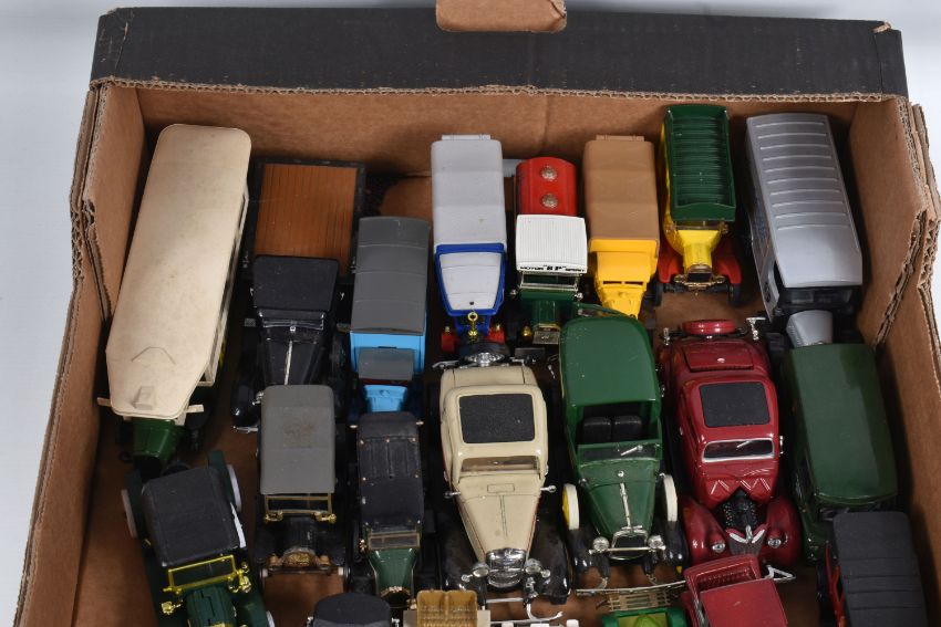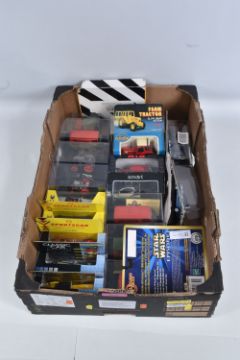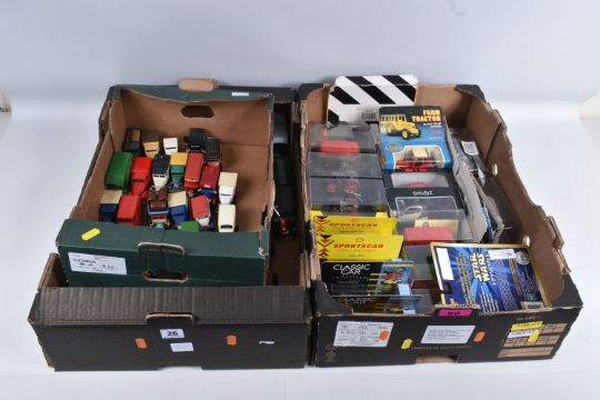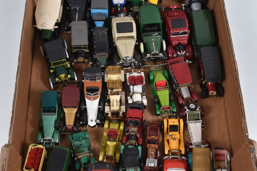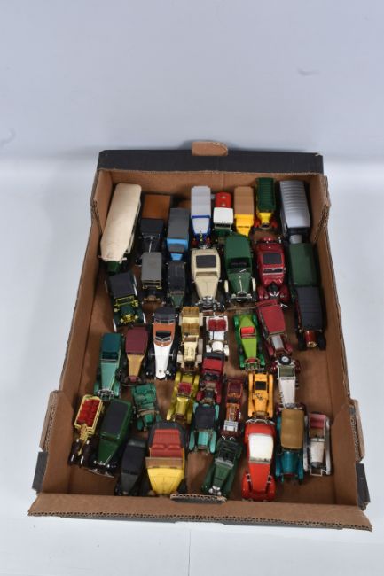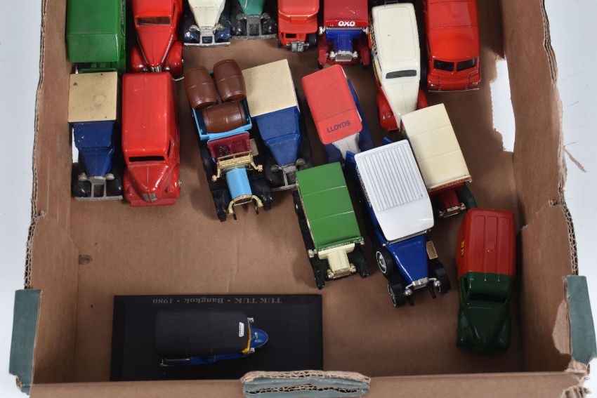A COLLECTION OF BOXED AND UNBOXED ASSORTED VINTAGE DIECAST MODEL VEHICLES, a few of the unboxed vehicles are a Dinky no. 470 Austin 'Shell' Van in two tone green and red with extra 'BP' decal with black hubs, a Dinky no. 450 Trojan Van in red, a Matchbox Dinky 1948 Commer 8cwt Van 'Sharps Toffee' in red no. DY8-B, a Matchbox Models of Yesteryear 1911 Renault Lesney in green no. Y2 , a Matchbox Models of Yesteryear 1918 Crossley Beer Lorry 'Lowenbrau' no. Y-26 to name a few of the unboxed models, also included is a tray of boxed models, to include three Classic Car model no.s 8873C, a Max Models Mercedes 300 SL 2nd GP Bern 1952 no. 432 003314, a Speedrive Farm Tractor in red, a Universal Hobbies Landini 1935 Velite V.L. 30 Grey Tractor, an Oxford Commercials Diecast Christmas Van 2408/8000 model no. JA009 to name a few, condition of the loose models range from good to playworn with paint loss and wear, the outer cardboard boxes and perspex cases appear in good condition showing wear on corners and edges from storage and handling, contents not checked for completeness (3 trays)