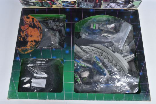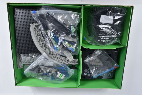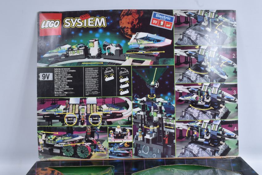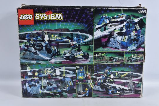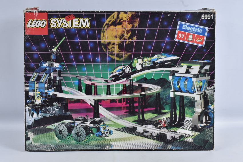 A BOXED OPENED LEGO SYSTEM MONORAIL TRANSPORT BASE ELECTRIC SYSTEM MODEL, number 6991, model is un-made and housed inside its original box however parts are loose inside or have been repacked into plastic bags, not checked for completion, box shows a lot of wear all over but mainly to sharp edges and corners with some losses and tears to panels, includes instructions
