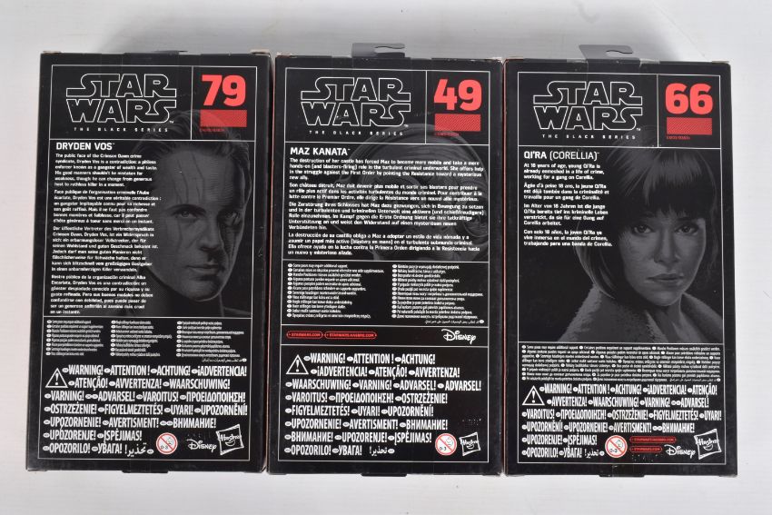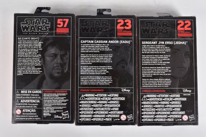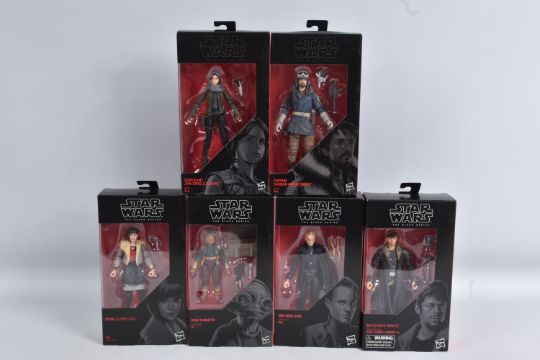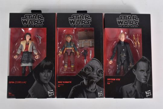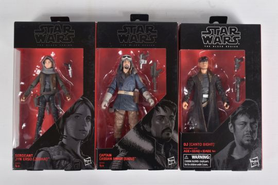 SIX BOXED HASBRO STAR WARS 'THE BLACK SERIES' FIGURES, to include number 22 Sergeant Jyn Erso (Jedha) no. B9394, number 23 Captain Cassian Andor (Eadu) no. B9395, number 49 Maz Kanata no. C3289/B3834, number 57 DJ (Canto Bight) no. E0622/B3834 Asst., number 66 Qi-Ra (Corellia) no. E1203/B3834, and number 79 Dryden Vos no. E4070/B3834, the condition is good, the outer boxes are in like new condition, each boxed is sealed