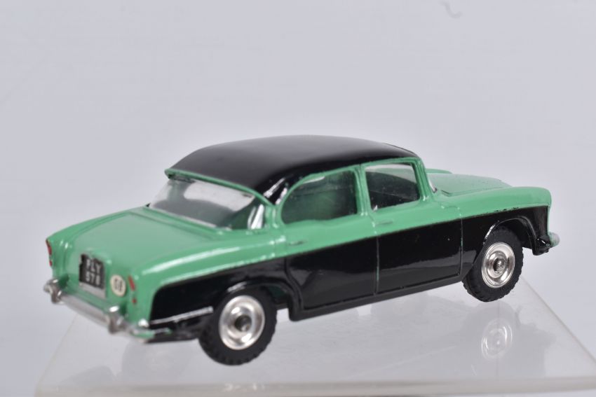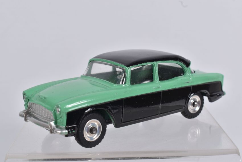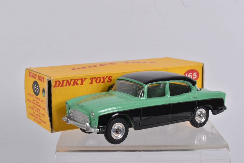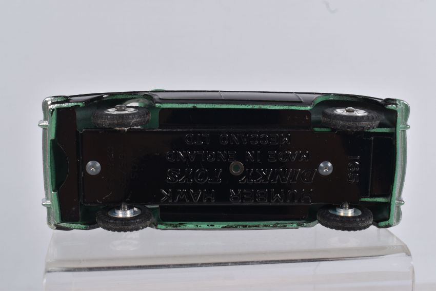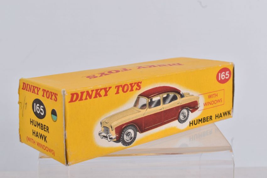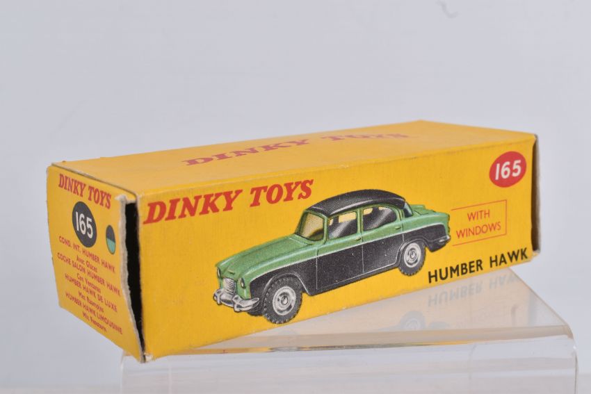 A BOXED DINKY TOYS DIECAST HUMBER HAWK, no. 165, black roof and base, green centre, silver detail, picture box, one internal panel missing, colour indicator present, but overall box and model in great condition, possible restorations