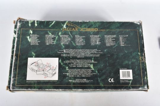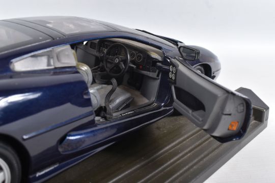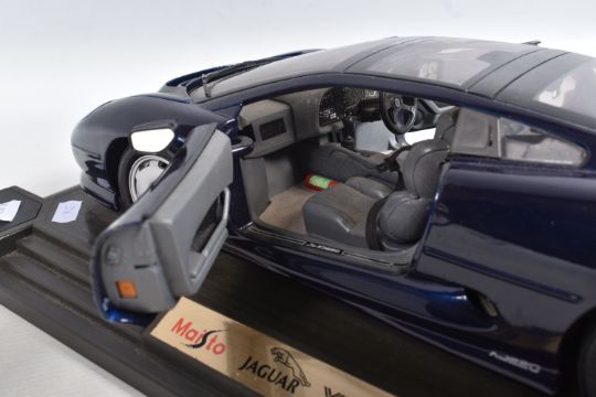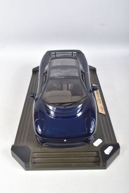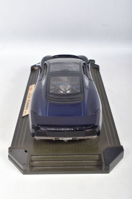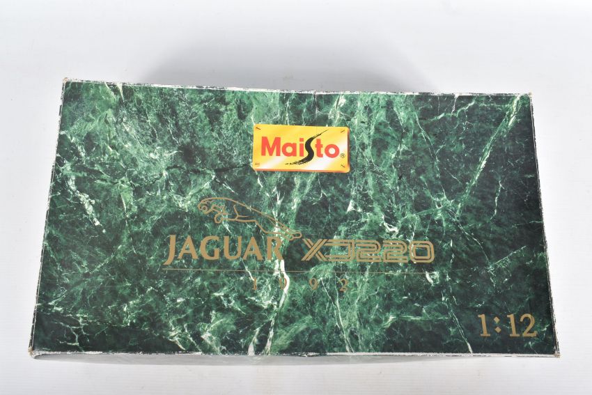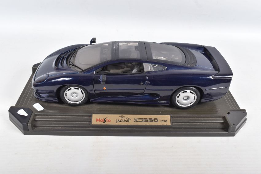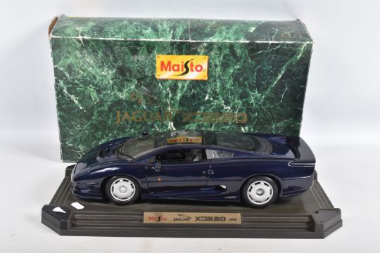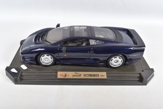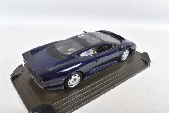 A BOXED MAISTO DIECAST & PLASTIC 1/12 SCALE 1992 JAGUAR XJ220 CAR MODEL, No.33201, version in metallic dark blue, appears complete and in very good condition, mounted on a stepped plastic plinth which is missing a corner cover piece but otherwise in good condition, box complete but has some damage and wear