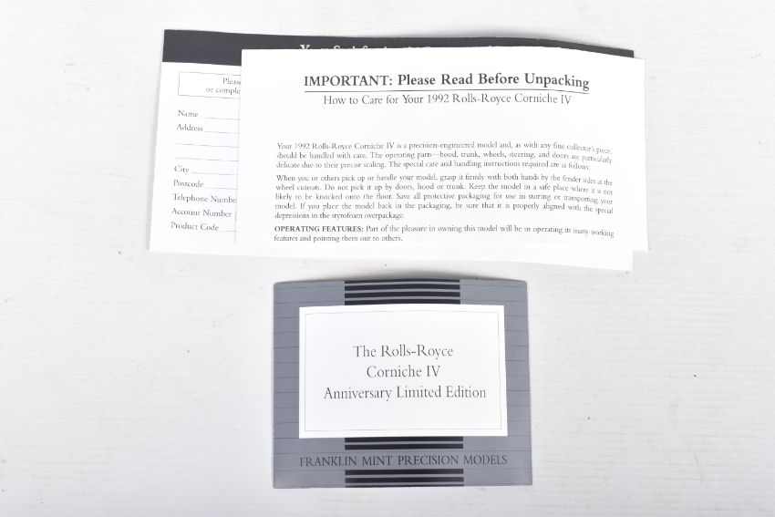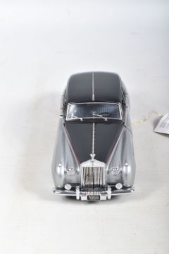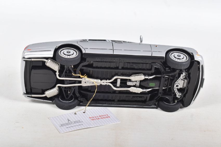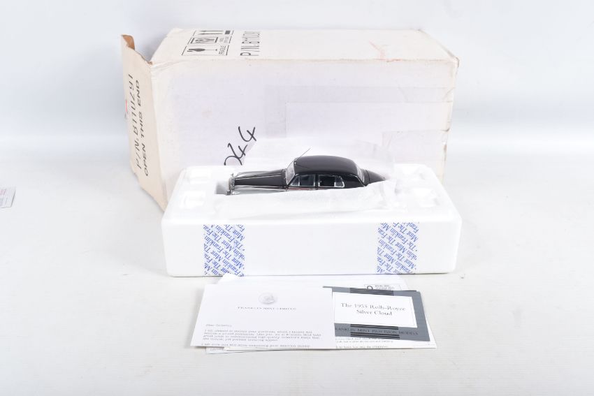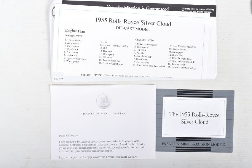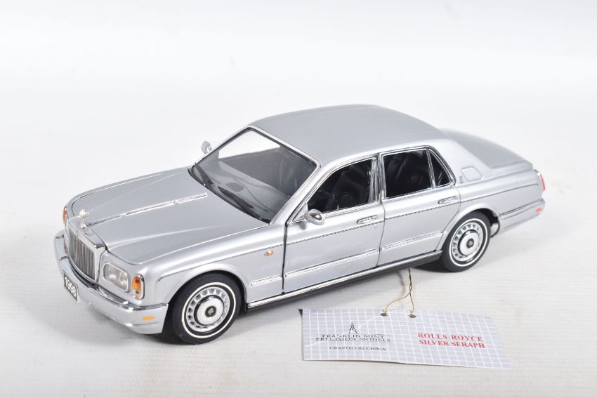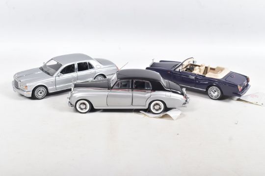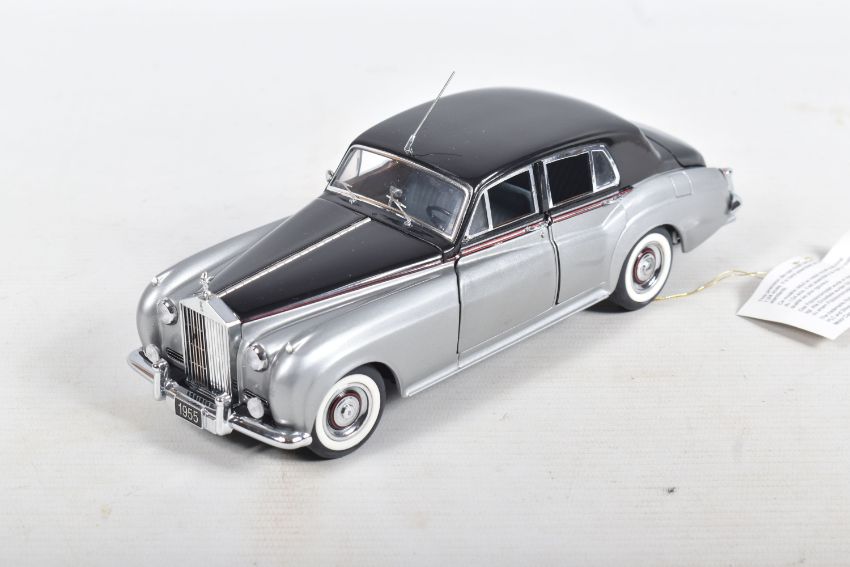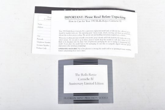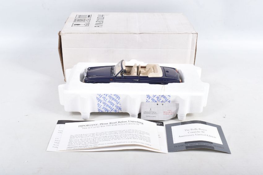 THREE BOXED FRANKLIN MINT 1/24 SCALE ROLLS-ROYCE MOTOR CAR MODELS, 1955 Silver Cloud I (B11UZ91), 1993 Corniche IV Anniversary Limited Edition (B11UD44) and 1998 Silver Seraph (B11XN59), all appear complete and in very good condition, look to have hardly, if ever been removed from boxes, Silver Cloud and Corniche both with Certificates of Authenticity, other paperwork and swing tag, Silver Seraph is missing all paperwork except swing tag, boxes all complete with packing but have some minor damage and wear to outer cardboard boxes