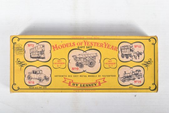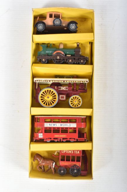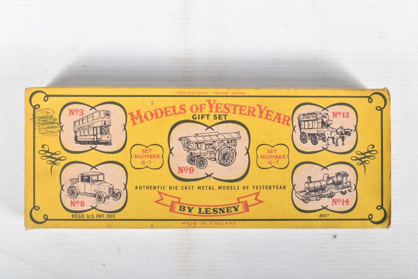 A BOXED MATCHBOX MODELS OF YESTERYEAR GIFT SET, No.G-7, comprising E class Tramcar, No.Y-3, Morris Cowley Bullnose, No.Y-8, Fowler Showmans Engine, No.Y-9, Horse Bus, No.Y-12 and 'Duke of Connaught' Locomotive, No.Y-14, all appear complete and in good condition but some with minor paint loss, wear and minor corrosion, box complete with interior but has minor damage, marking and wear,