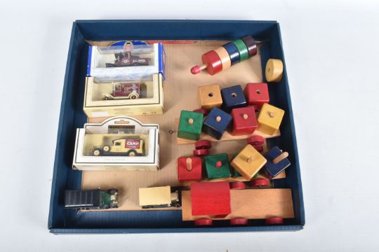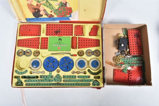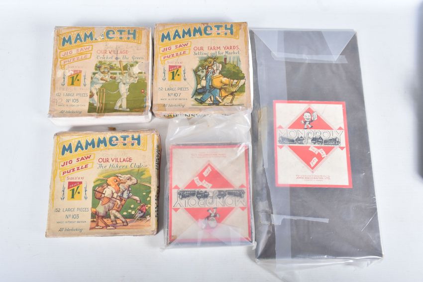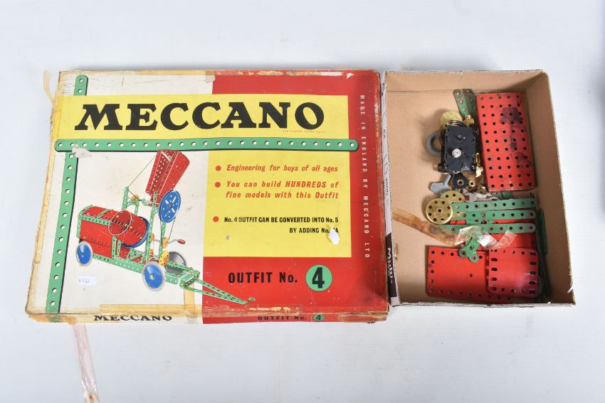A BOXED MECCANO OUTFIT No.4, red and green era, contents not checked but appears to be missing some parts, with a quantity of extra loose parts including gears and hinged flat plate, three boxed vintage Mammoth Playtime Series wooden jigsaw puzzles, contents not checked, one box states that a piece is missing, boxed Monopoly set, contents not checked, quantity of babies wooden blocks & toys, small quantity of boxed and unboxed Lledo diecast vehicles, majority of boxes with damage and wear (2 boxes)