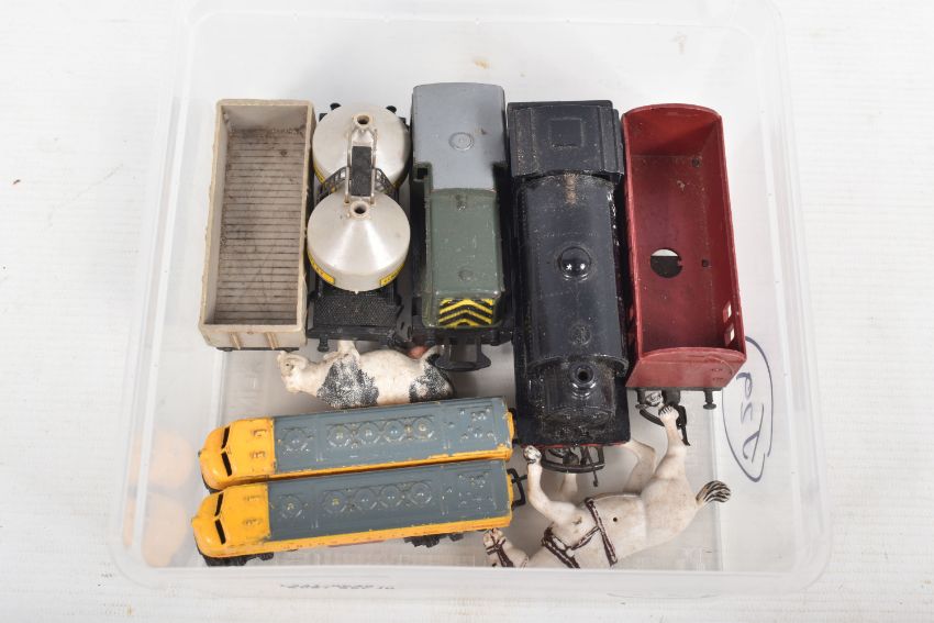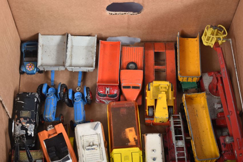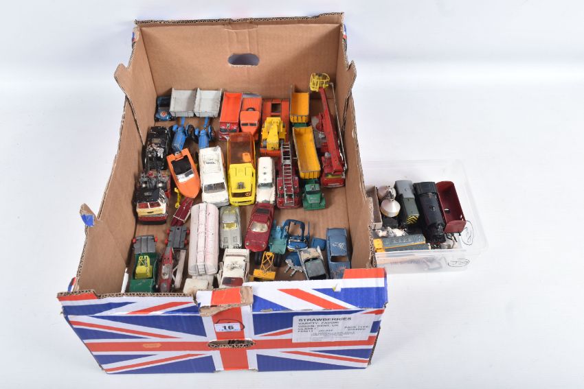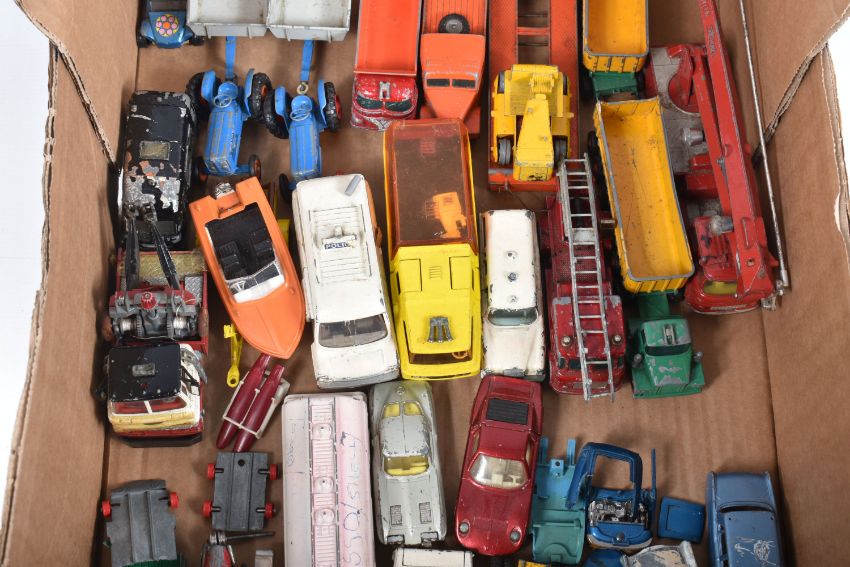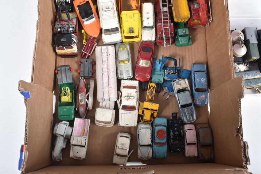 A QUANTITY OF UNBOXED ASSORTED PLAYWORN DIECAST VEHICLES, to include Matchbox King Size Scammell Constructor Prime Mover, Transporter Trailer (replacement drawbar) & Caterpillar D9 Crawler Tractor, No.K8-1, Dinky Toys Ford Zodiac Police Car, No.255, Corgi Toys Chevrolet Corvette Stingray, No.310, silver body, includes a quantity of repainted models, with a small quantity of unboxed OO/HO gauge model railway items, including Tri-ang 0-6-0 Saddle Tank, No.748, repainted and numbers painted over, missing front buffers (R153), Mettoy Playcraft North British Shunter No.D2705 (P838), Lone Star OOO etc. (2 boxes)