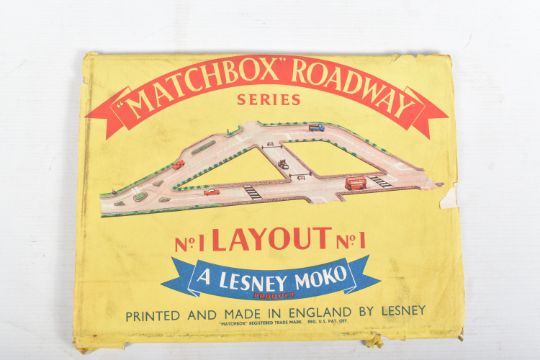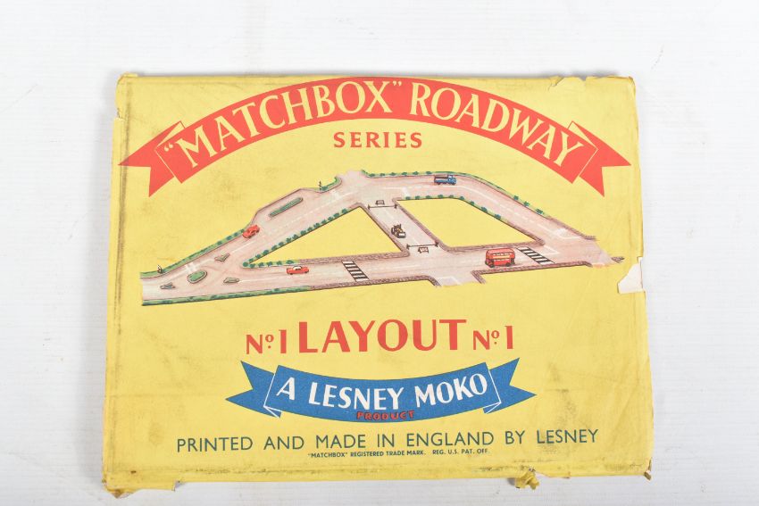 THREE MATCHBOX ROADWAY FOLDED CARD LAYOUTS, No.1 in Lesney Moko sleeve, No.R2 London, missing sleeve and London Famous Landmarks, No.R3 in Lesney sleeve, No's.1 & R3 both unused in very good condition, buildings and accessories not cut out or folded up, No.R2 is complete but has creasing, marking and wear, both sleeves with damage, a quantity of boxed and unboxed Matchbox diecast vehicles, boxed King Size Weatherill Hydraulic Shovel, No.1, boxed Ford Thames Trader Wreck Truck, black wheels, grey hook, No.13, in type D box, boxed Saladin Armoured Car, No.67, in Moko Lesney type B box and three unboxed models in playworn condition with paint loss and wear, all boxes complete but have minor damage, marking and wear, together with a copy of the 1959 24 page Catalogue, complete and in fairly good condition but does have marking and wear (10)