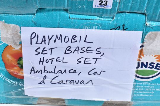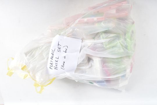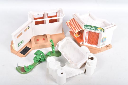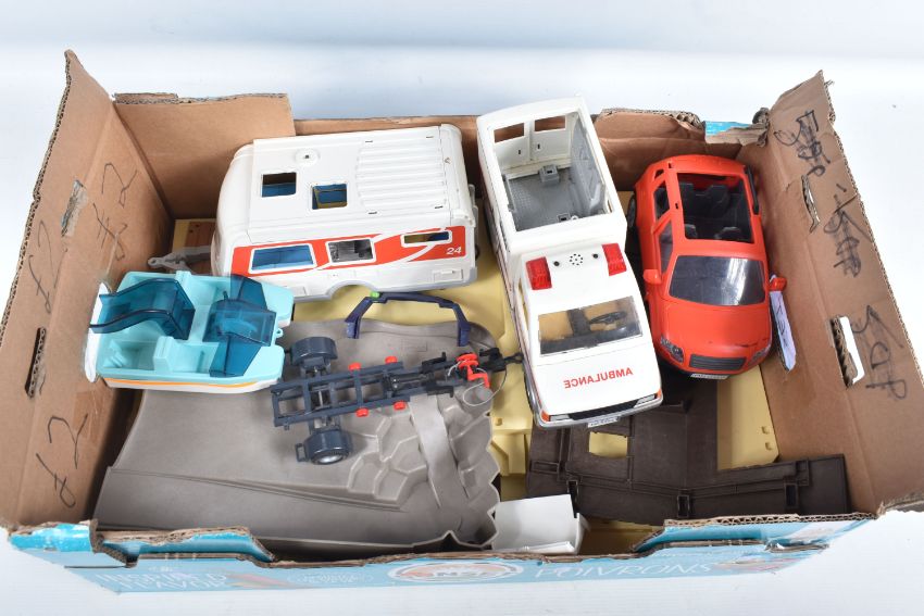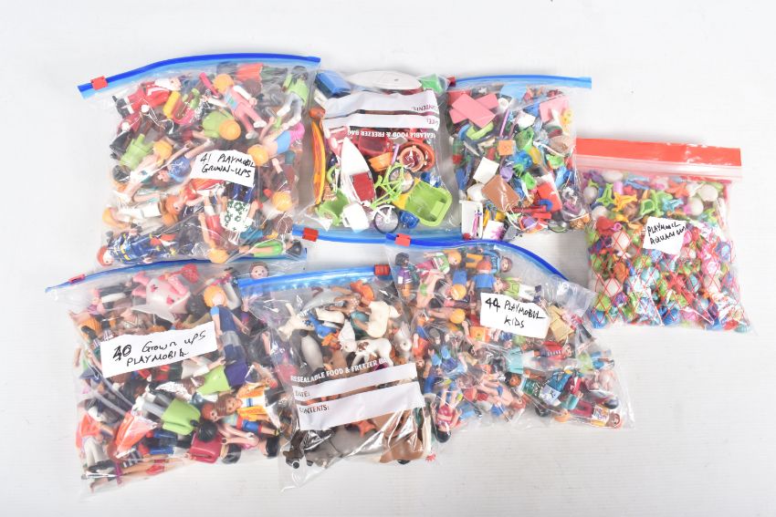 A QUANTITY OF LOOSE PLAYMOBIL SETS, FIGURES, AND ACCESSORIES, from camping, forestry, aquamarine, waterpark and others, customer states over 140 figures including animals, sea creatures, a hotel set and bases, ambulance, caravan, cars etc, some are missing parts