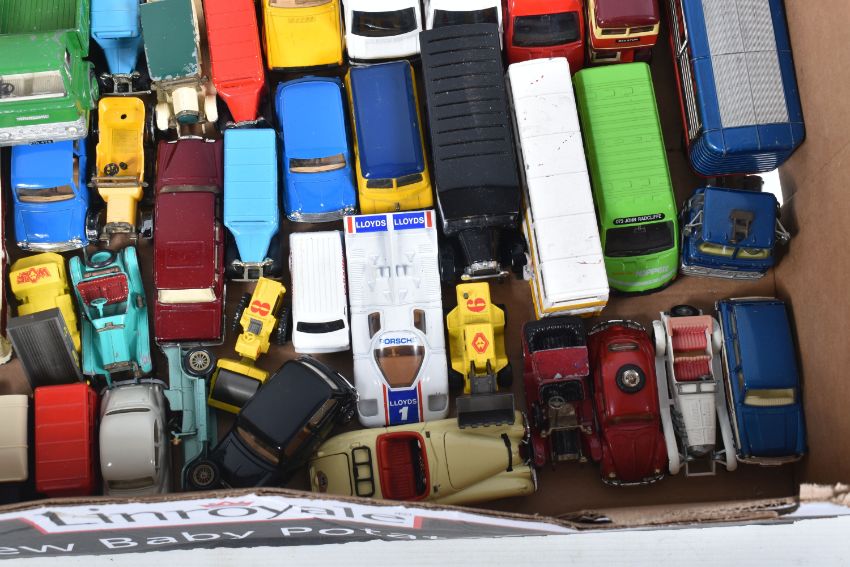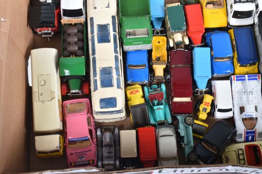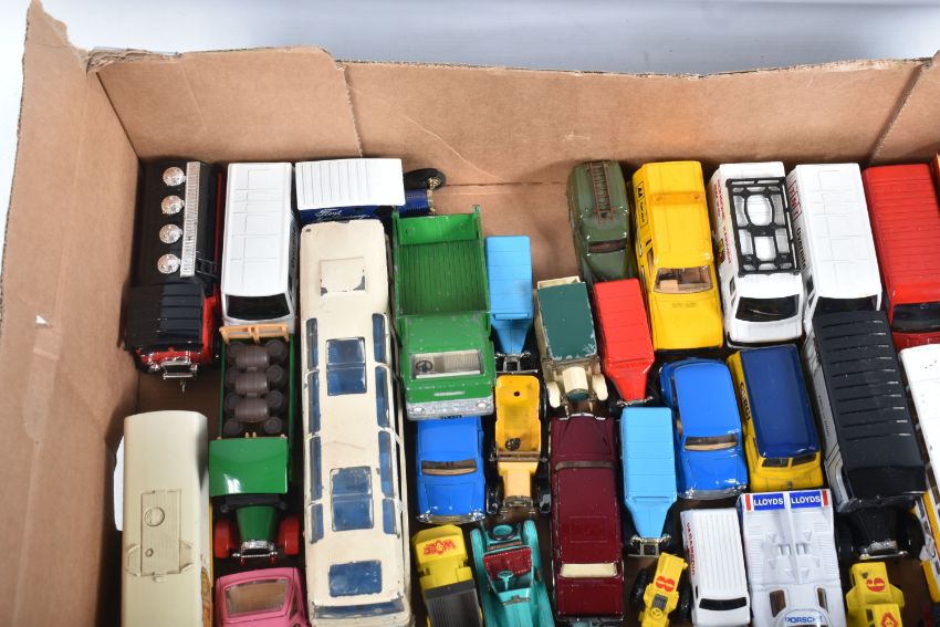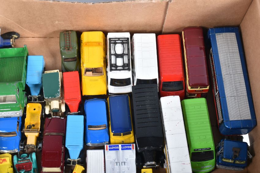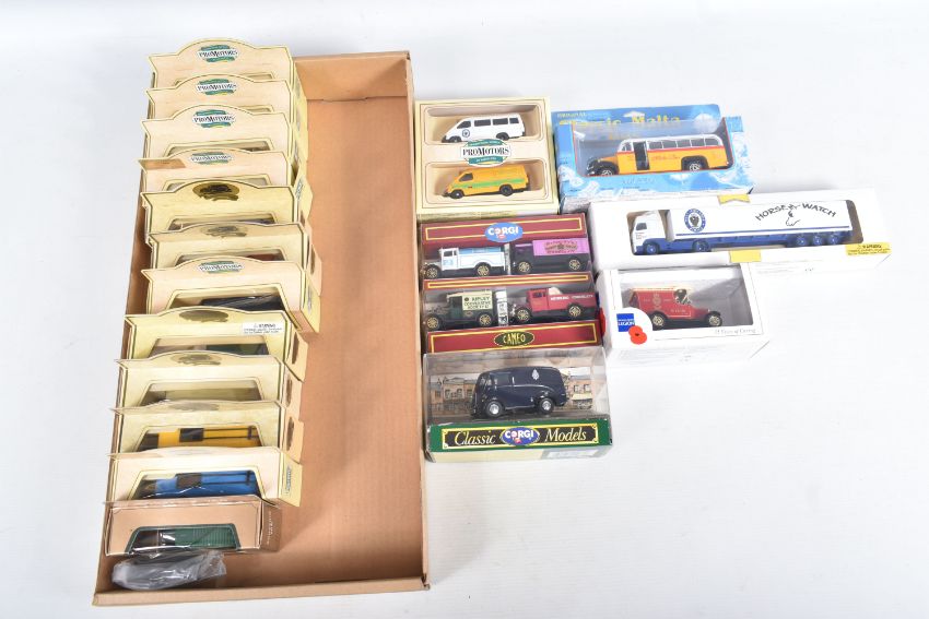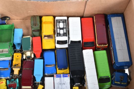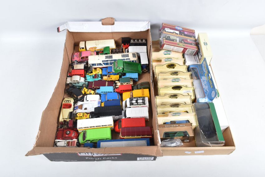 A COLLECTION OF BOXED AND LOOSE CORGI, DINKY LESNEY AND LLEDO DIECAST MODEL VEHICLES, to include a boxed Original Classic Malta Bus, an unboxed Corgi Major Toys Ford Tilt Cab with articulated trailer 'Express Service' in white no. 1137, an unboxed Dinky Supertoys Vega Major Luxury Coach no. 952, an unboxed Dinky Toys Ford D 800 Tipper Truck in green and an unboxed Dinky Supertoys Leyland Octopus truck 'Shell/BP' black tires and grey hubs, no. 944, the models vary in condition from good to playworn, the outer cardboard boxes show slight wear on corners and edges, contents unchecked for completeness (2 trays)