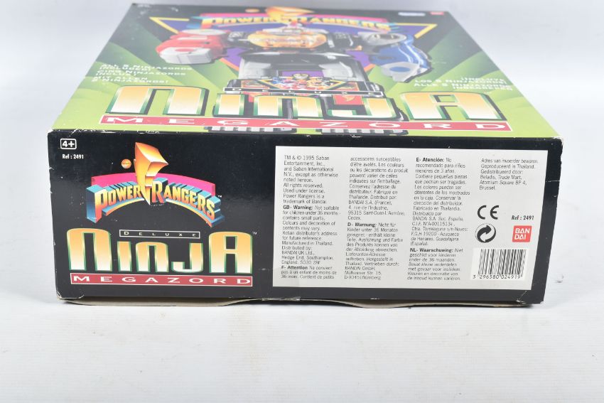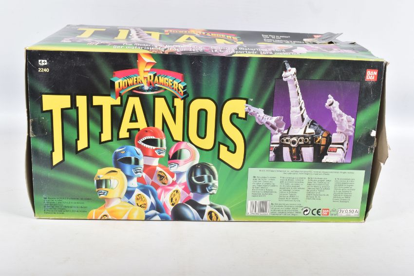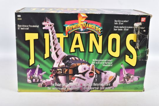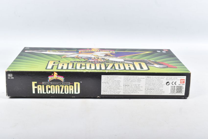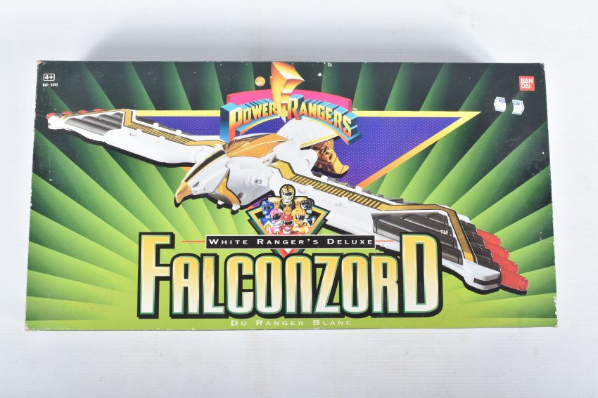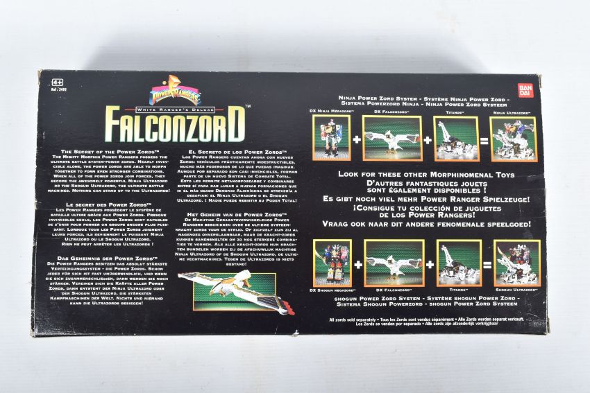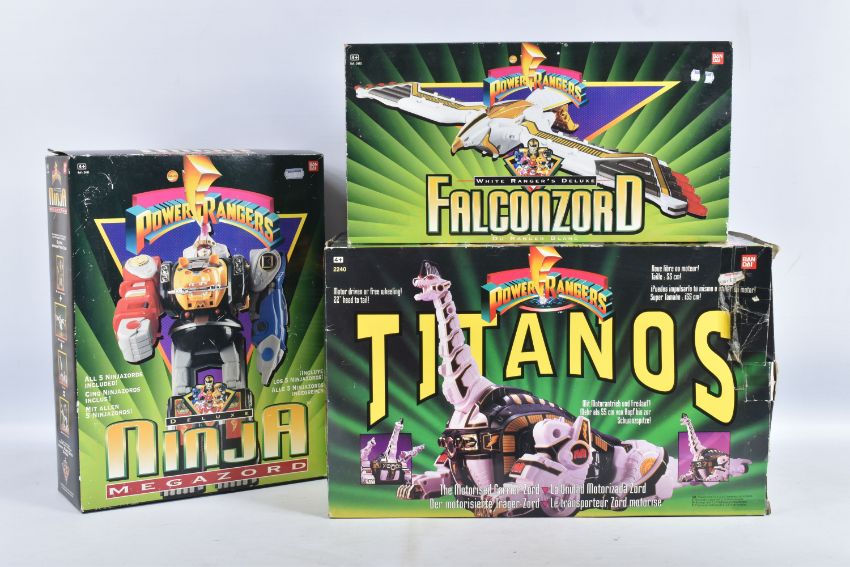 THREE BOXED 1990'S BANDAI POWER RANGERS FIGURES, to include a Deluxe Ninja Megazord, reference 2491, includes many figure, bear bit, power sword, and instructions, the second a White Ranger Deluxe Falconzord, reference 2492, includes model, instructions and spent sticker sheet, the third a Titanos, reference 2240, appears complete with control reins and harness, boxes mixed from very good to worn with tape to panels