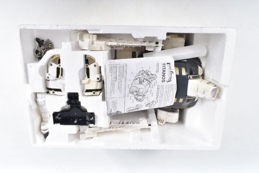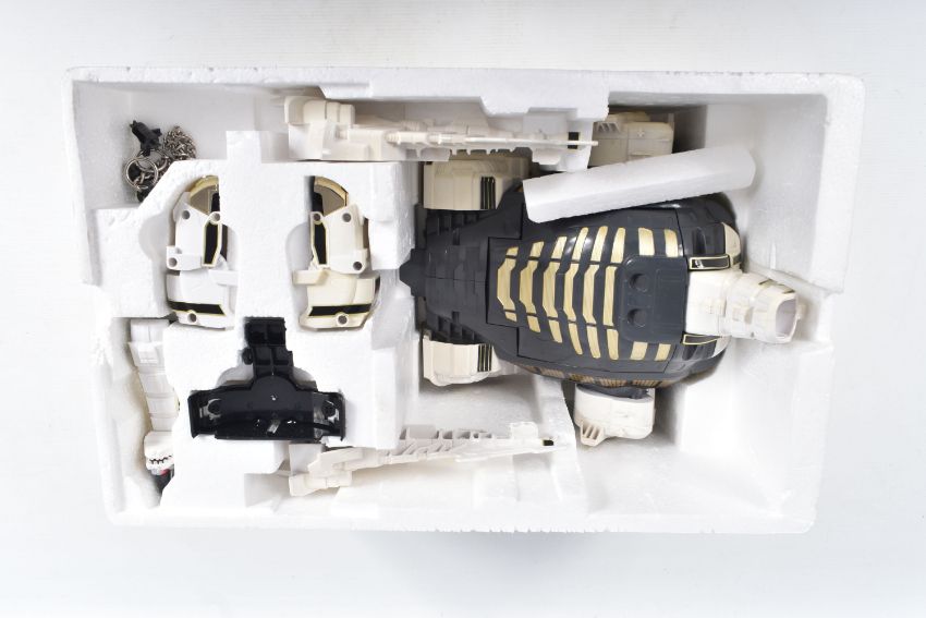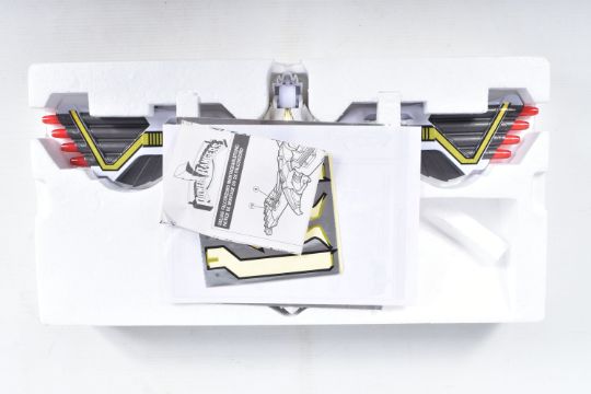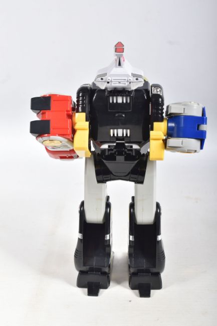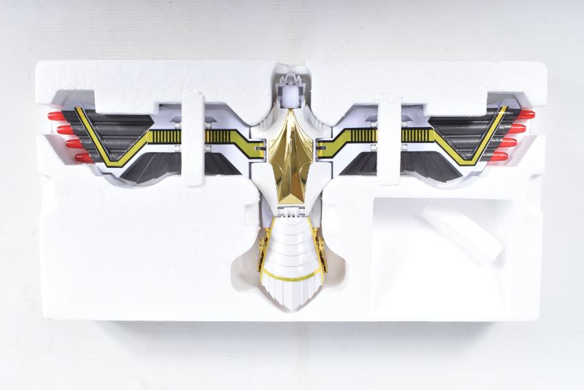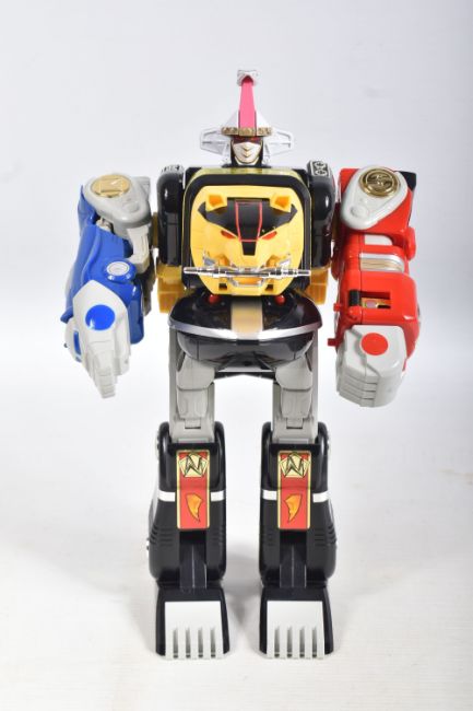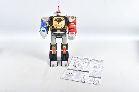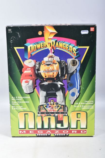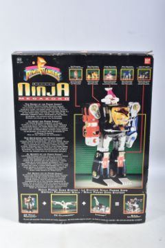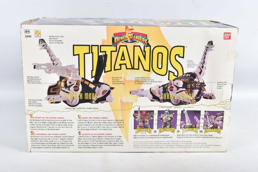 THREE BOXED 1990'S BANDAI POWER RANGERS FIGURES, to include a Deluxe Ninja Megazord, reference 2491, includes many figure, bear bit, power sword, and instructions, the second a White Ranger Deluxe Falconzord, reference 2492, includes model, instructions and spent sticker sheet, the third a Titanos, reference 2240, appears complete with control reins and harness, boxes mixed from very good to worn with tape to panels