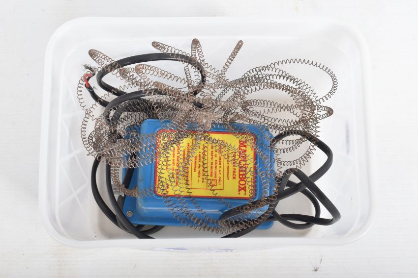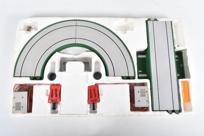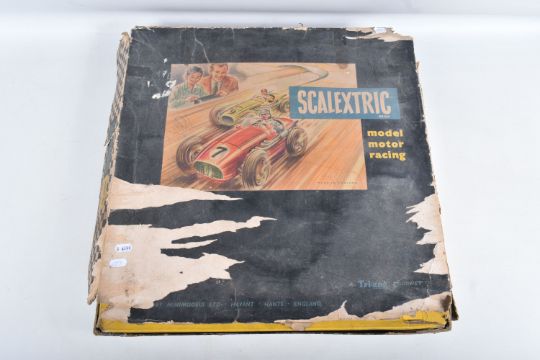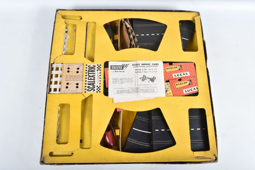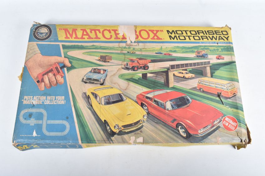 A BOXED EARLY SCALEXTRIC RACING SET, to include tinplate Maserati 250F F1 car, green body, red nose, RN7, appears complete and in fairly good condition with some minor paint loss and wear, with an incomplete similar car red body, cream nose, RN8, body chassis and driver only, no wheels, motor or interior, quantity of track, cardboard bridge, fencing, oil bottle , Silicone skid patch fluid bottle, battery box and controller, box with inner tray but has damage and wear, with a boxed Matchbox Motorised Motorway set, No.M-2, contents not checked but missing both vehicles,