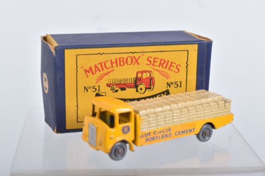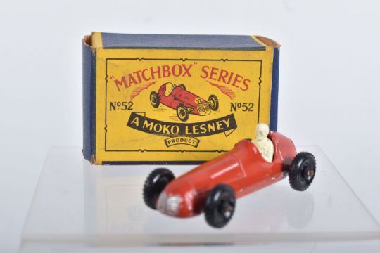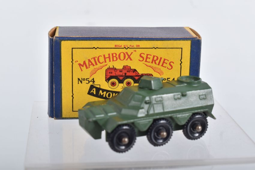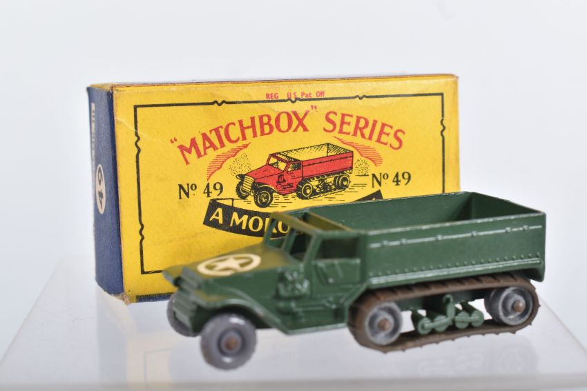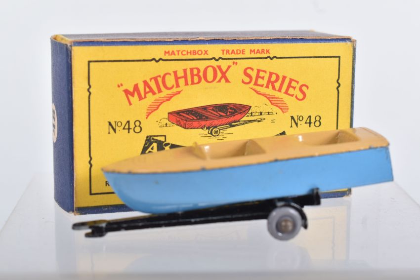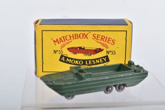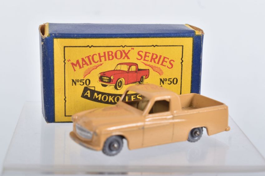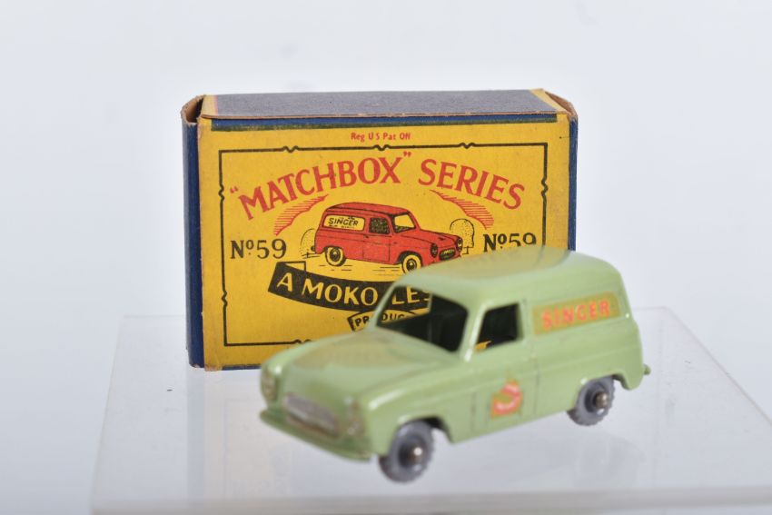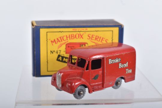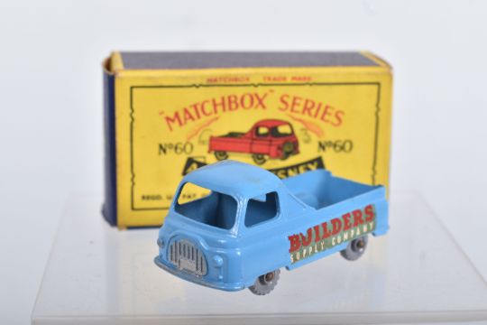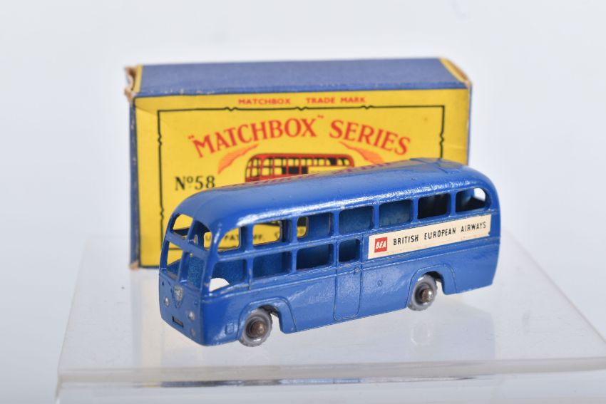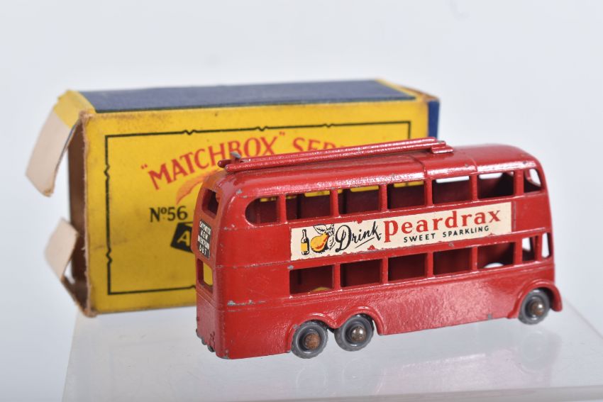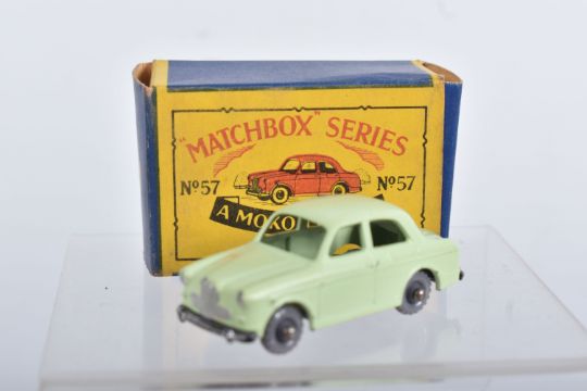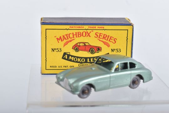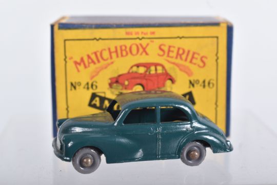 BOXED MATCHBOX 1-75 SERIES MODELS No's 46-60, all appear complete and in good condition with minor paint loss and wear, very minor surface rusting to some axles, includes Morris Minor 1000, No.46, dark blue/green body, grey plastic wheels, Aston Martin DB2-4 Mk.1, No.53, metallic green body, grey plastic wheels, London Trolleybus, No.56, red poles, grey plastic wheels, all contained in Moke Lesney type B boxes with some damage, marking and wear, some with missing or detached flaps