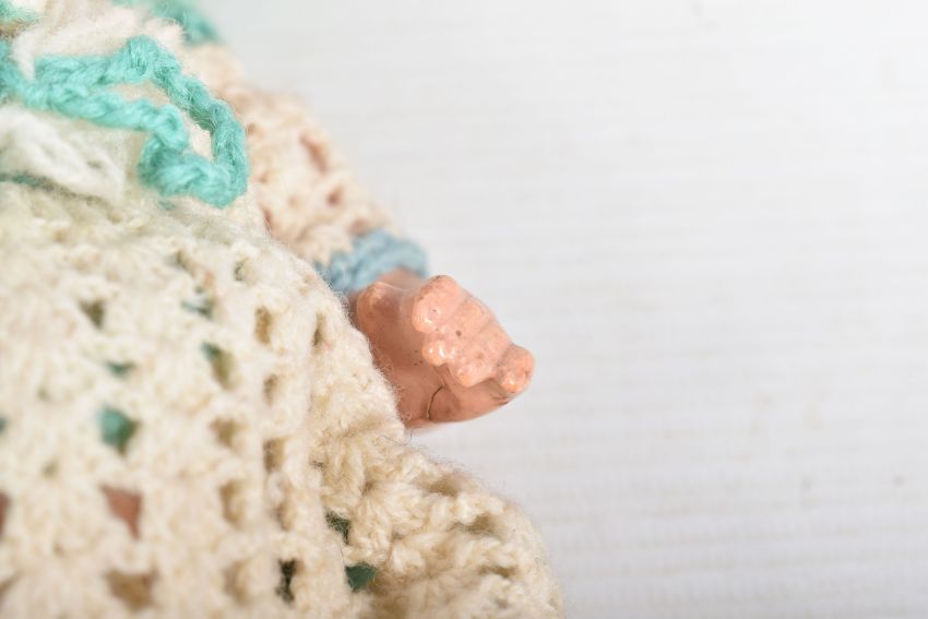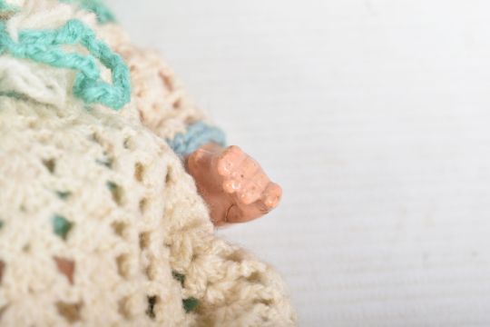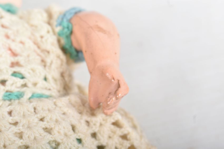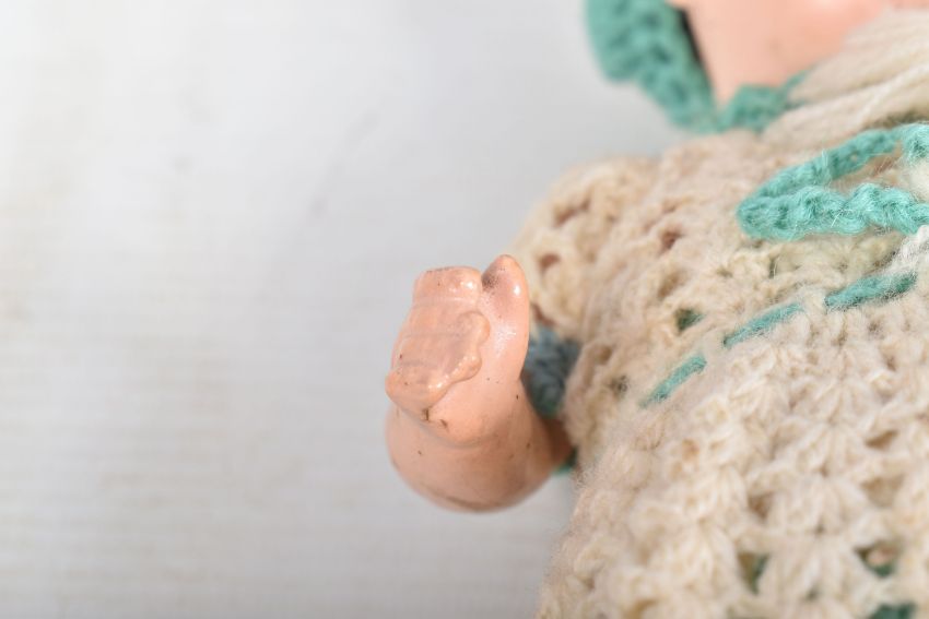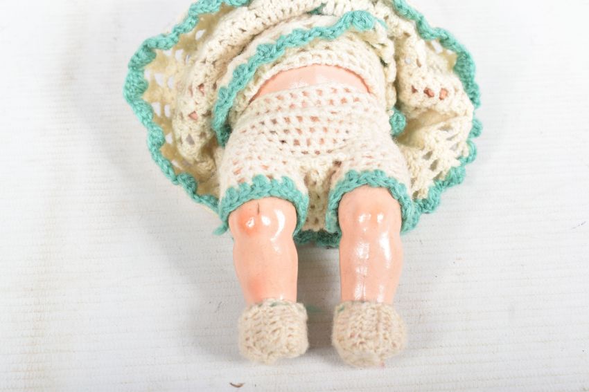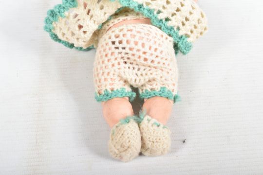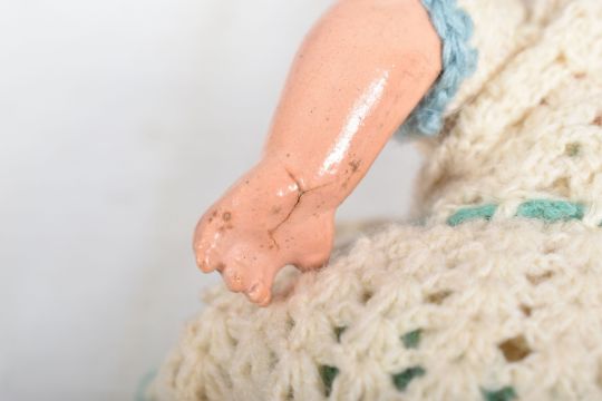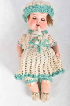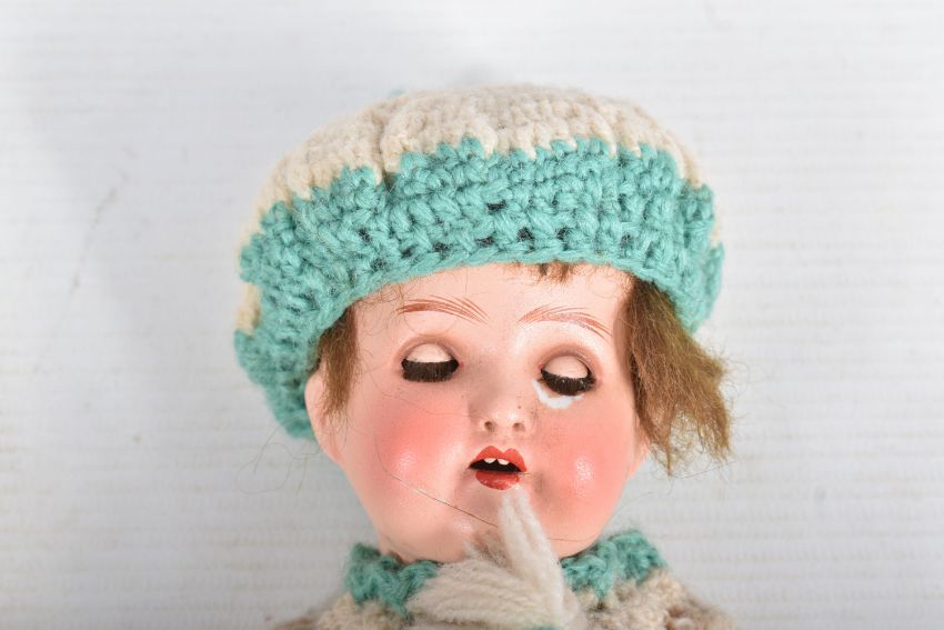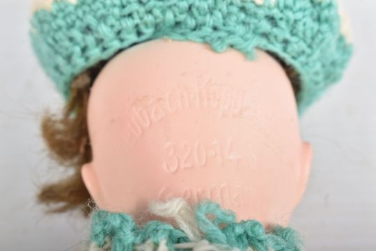 A HEUBACH KOPPELSDORF BISQUE HEAD DOLL, nape of neck marked 'Heubach Koppelsdorf 320.14/0 Germany' sleeping amber glass eyes with lashes, open mouth showing two teeth, original cut? wig, damage, large crack and minor paint loss to head, jointed composition body, damage to right foot, cracks to both hands but otherwise in fairly good condition with only minor marking and wear, height approx. 22cm