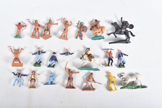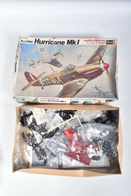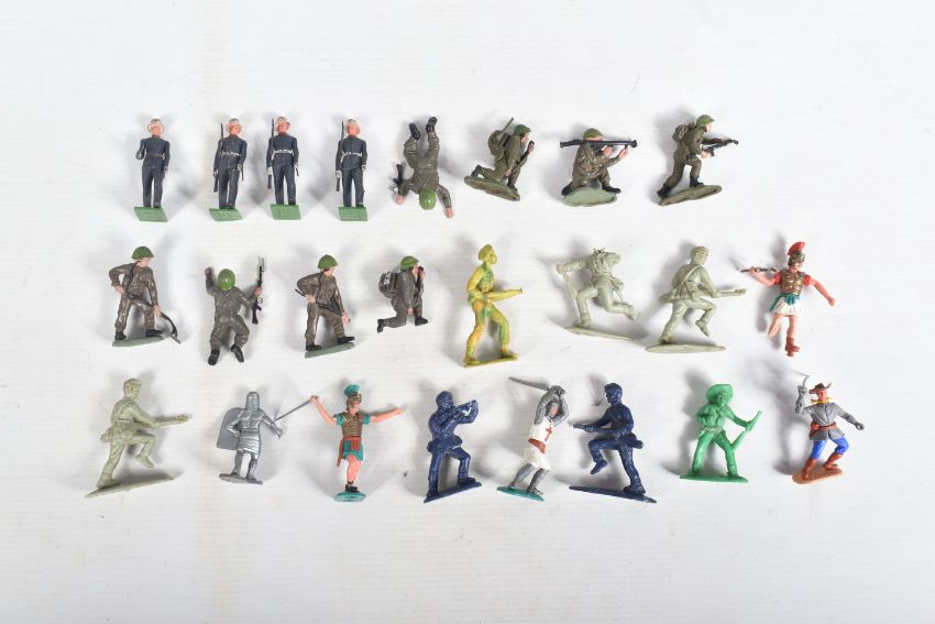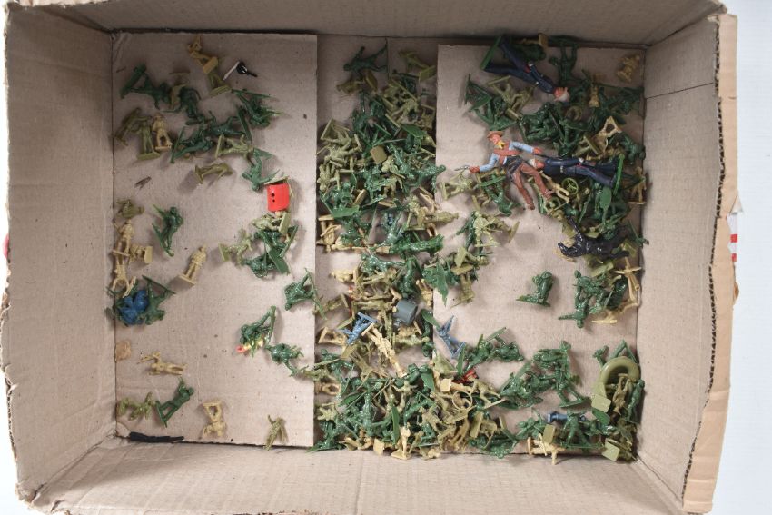 A QUANTITY OF ASSORTED PLASTIC SOLDIER AND OTHER FIGURES, Airfix, Timpo, Cherilea, Britains and others, various Soldiers, Cowboys, Native Americans, Cavalry, Knights etc., mixture of scales, all in playworn condition, some with damage, wear, may be missing small accessories, with a Revell Hurricane plastic kit box containing a small quantity of parts from various kits, including Scalecraft Racing Car, Aurora Frankenstein & The Mummy, all incomplete, assorted instructions and decals etc., box damaged (2 boxes)
