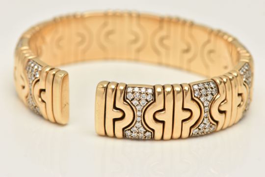 A 'BVLGARI' PARENTESI CUFF BRACELET, circa 1980s yellow metal flexible bracelet, set with two hundred and forty round brilliant cut diamonds, approximate internal diameter 56mm, approximate width 14.5mm, signed 'Bvlgari', stamped 750, approximate gross weight 80 grams, (condition report: general moderate wear, please note the bracelet does have a metal core, the weight given is of the total weight of the bracelet)