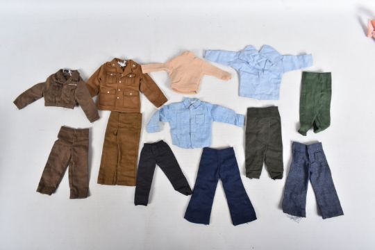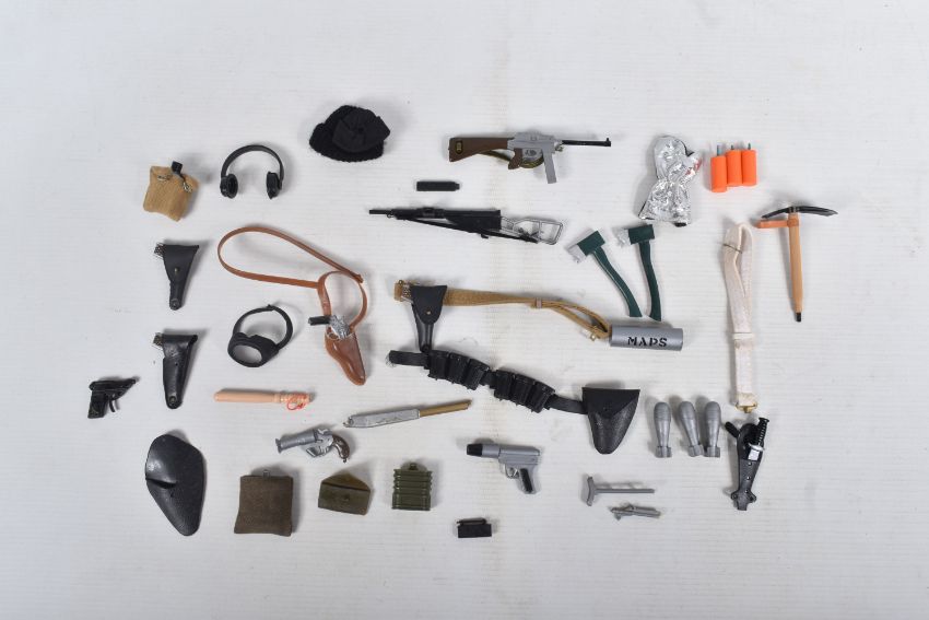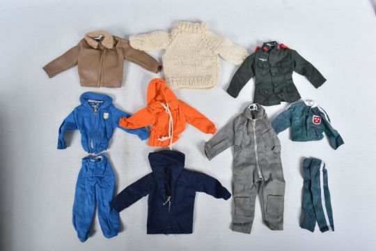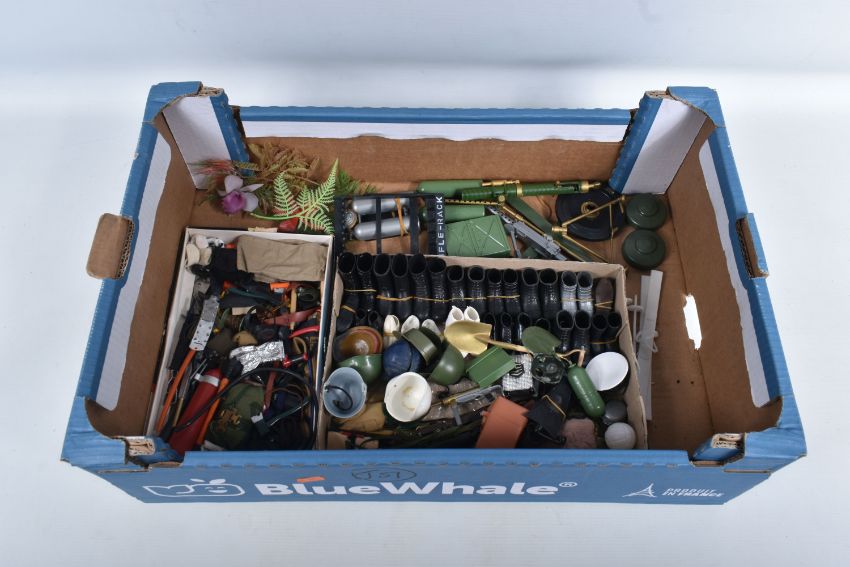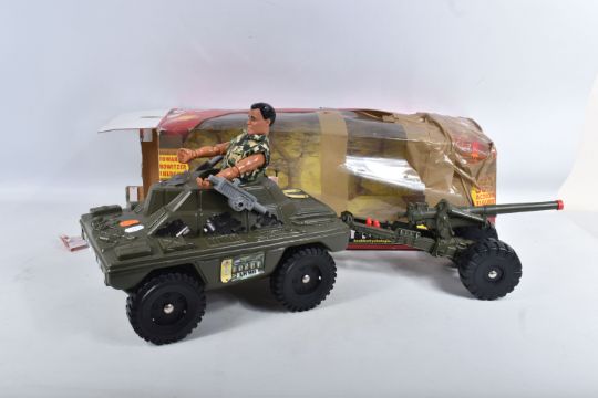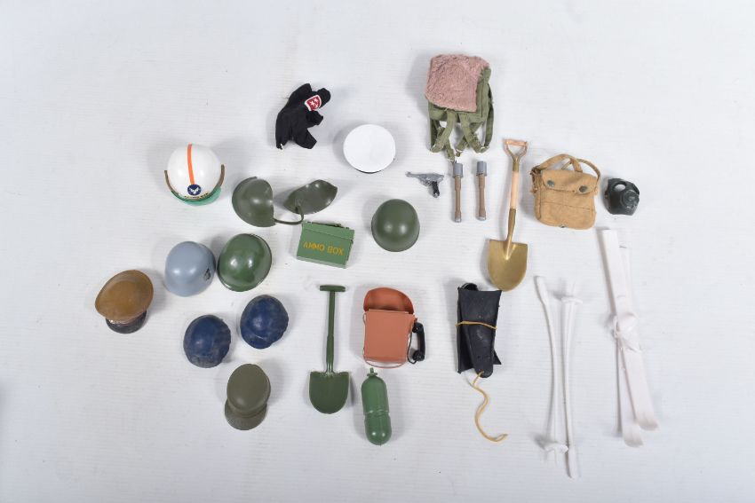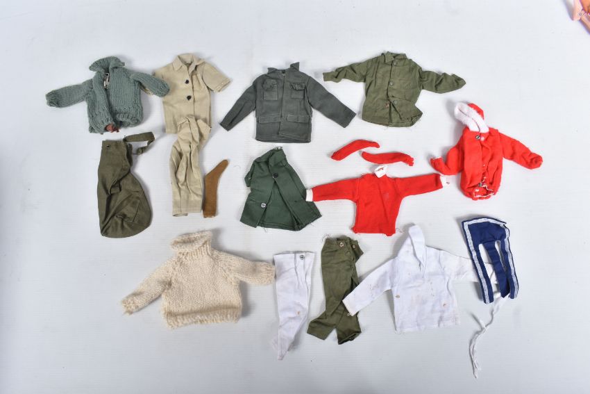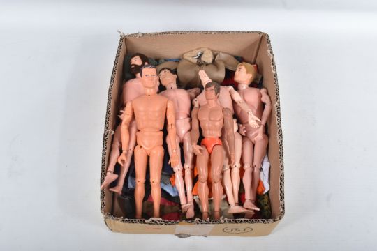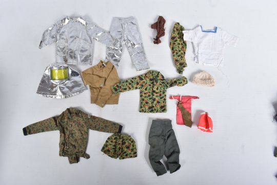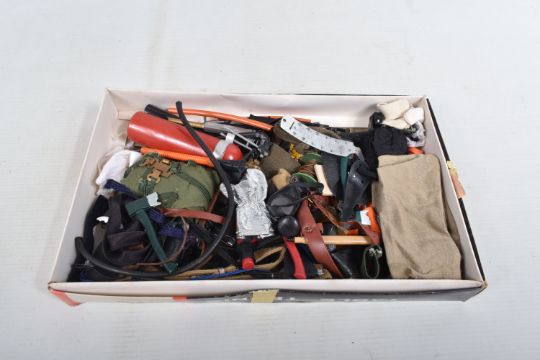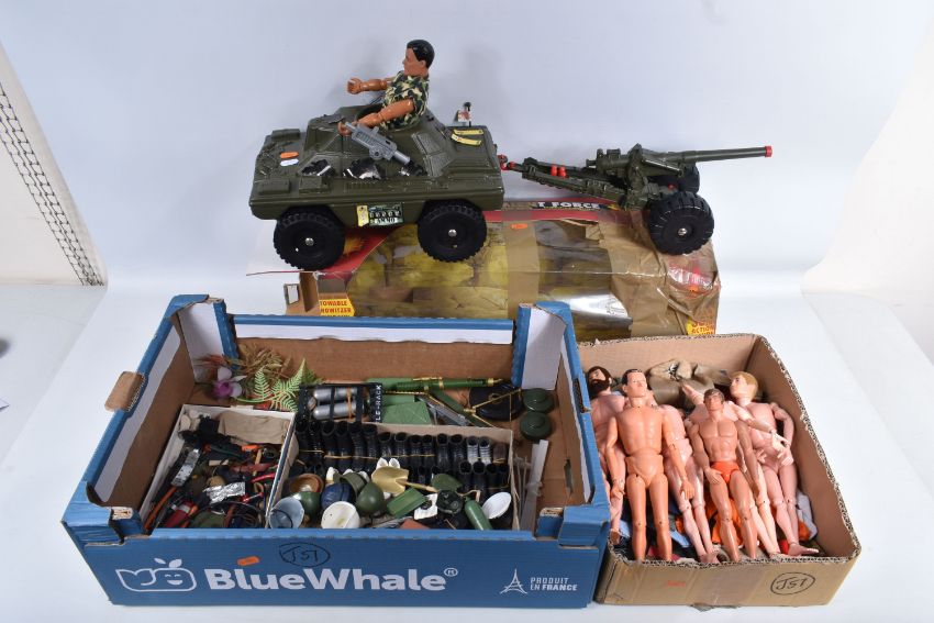 A COLLECTION OF UNBOXED ASSORTED PALITOY ACTION MAN AND OTHER ACTION FIGURES, UNIFORMS AND ACCESSORIES, Action Man figures are three flock haired examples, one fair haired, the other two dark, one with a beard, together with a headless example of similar vintage, other figures are a Pedigree Tommy Gunn figure and a Mattel Big Jim figure, all appear complete (except for the missing head) and in good condition, uniforms and clothing to include Sailor, German, Mountain/Arctic, Crash Crew, British Officer, Scramble Pilot, Tank Commander, various tracksuits and football boots etc., accessories to include mines, mortar etc., all in playworn condition some with minor damage, marking and wear, uniforms and accessories not checked for completeness, with a boxed Peterkin Strike Force Rapid Deployment Force Armoured Car & 155mm Howitzer Field Gun, No.3085, appears largely complete and in good condition with minor wear, mainly to decals but is missing some of the shells and rockets, box damaged (3 boxes)
