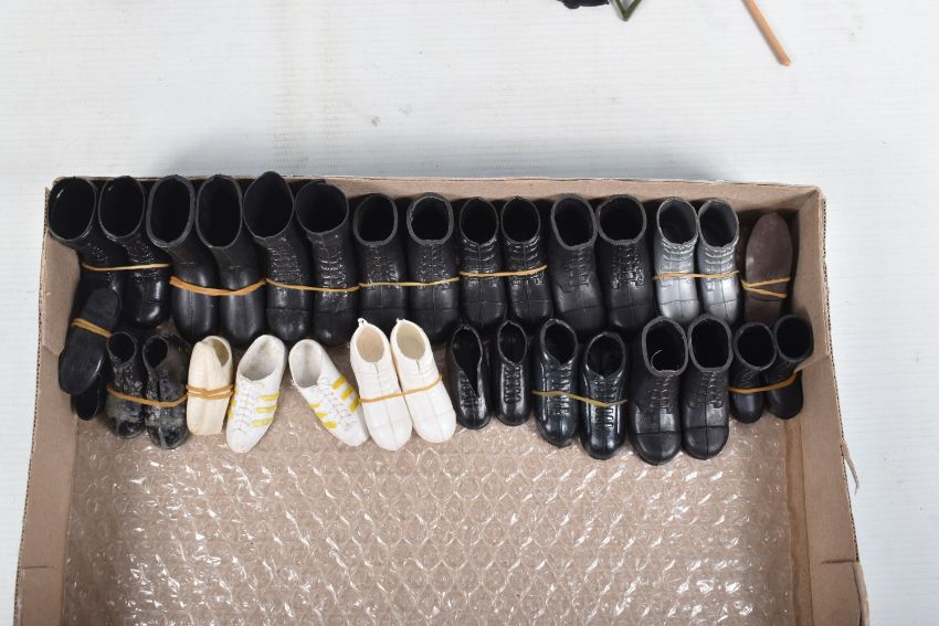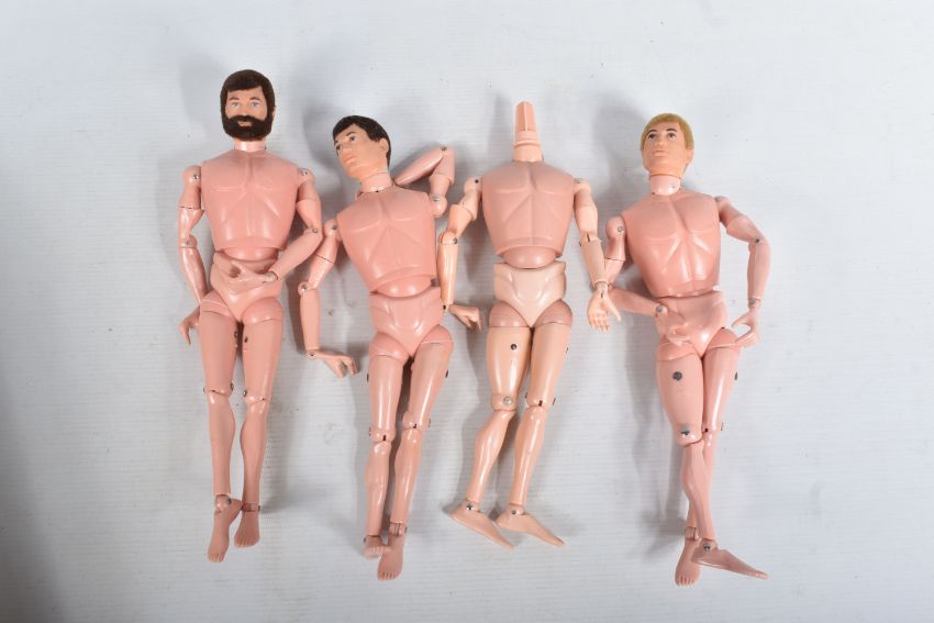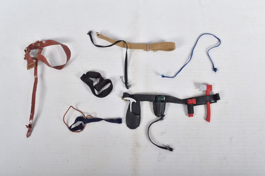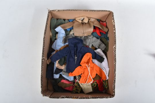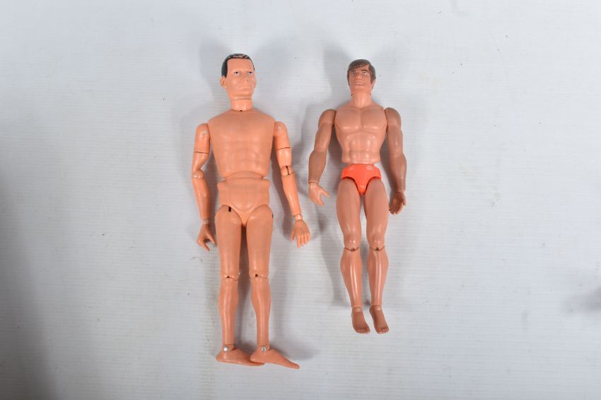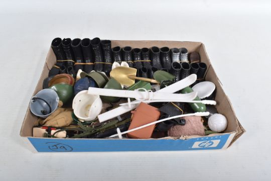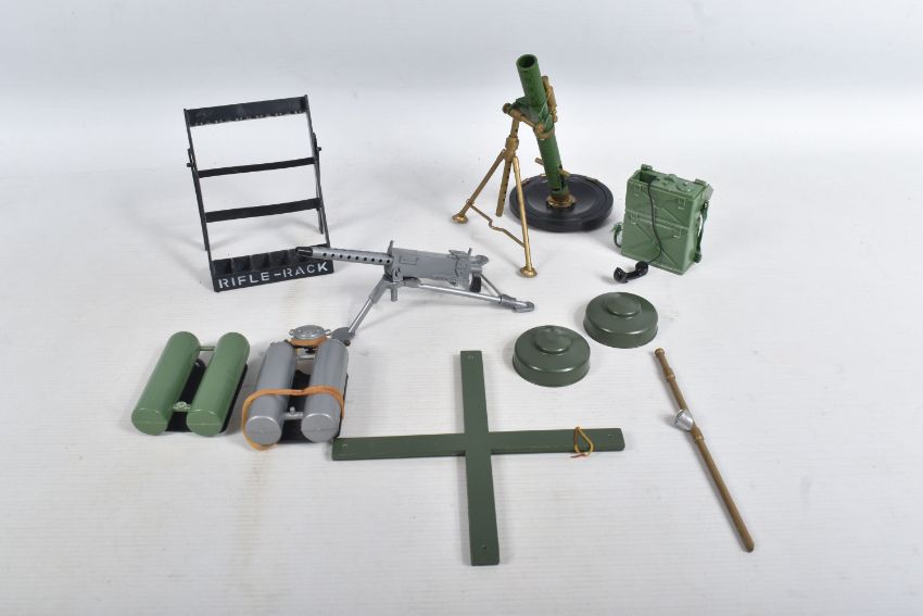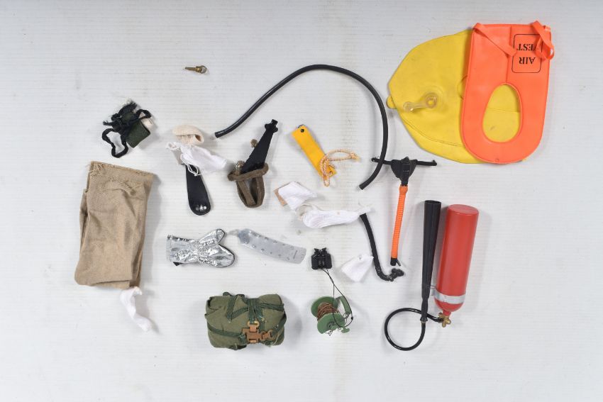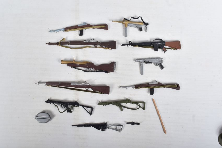 A COLLECTION OF UNBOXED ASSORTED PALITOY ACTION MAN AND OTHER ACTION FIGURES, UNIFORMS AND ACCESSORIES, Action Man figures are three flock haired examples, one fair haired, the other two dark, one with a beard, together with a headless example of similar vintage, other figures are a Pedigree Tommy Gunn figure and a Mattel Big Jim figure, all appear complete (except for the missing head) and in good condition, uniforms and clothing to include Sailor, German, Mountain/Arctic, Crash Crew, British Officer, Scramble Pilot, Tank Commander, various tracksuits and football boots etc., accessories to include mines, mortar etc., all in playworn condition some with minor damage, marking and wear, uniforms and accessories not checked for completeness, with a boxed Peterkin Strike Force Rapid Deployment Force Armoured Car & 155mm Howitzer Field Gun, No.3085, appears largely complete and in good condition with minor wear, mainly to decals but is missing some of the shells and rockets, box damaged (3 boxes)
