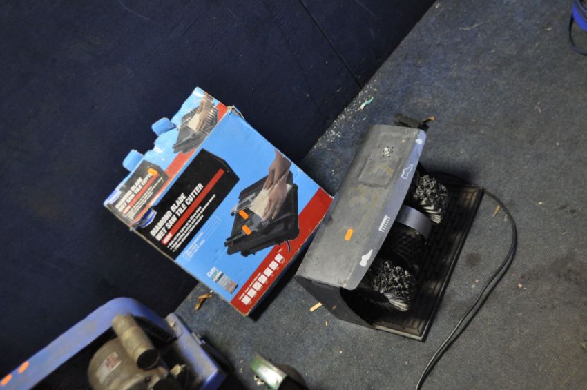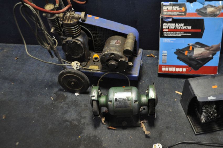 A VINTAGE AIR COMPRESSOR, a shoe shine wheel (both PAT pass and working), a Kamasa bench grinder with one wire wheel and a tile saw (both UNTESTED) (4)