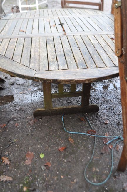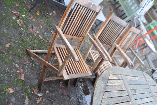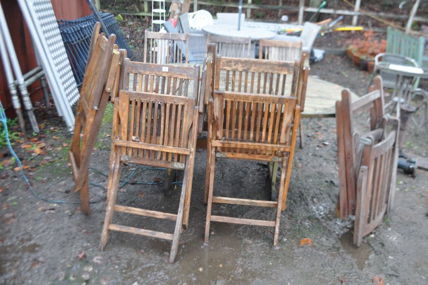 A ROYAL CRAFT DISTRESSED HARDWOOD EXTENDING GARDEN TABLE six folding chairs and a lounger extended length 181cm