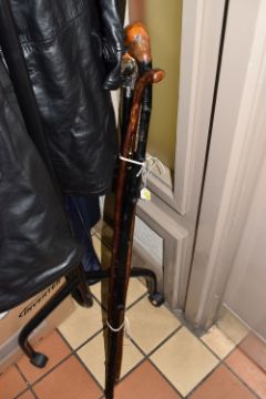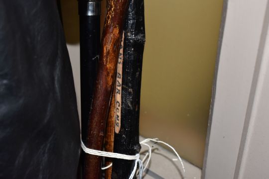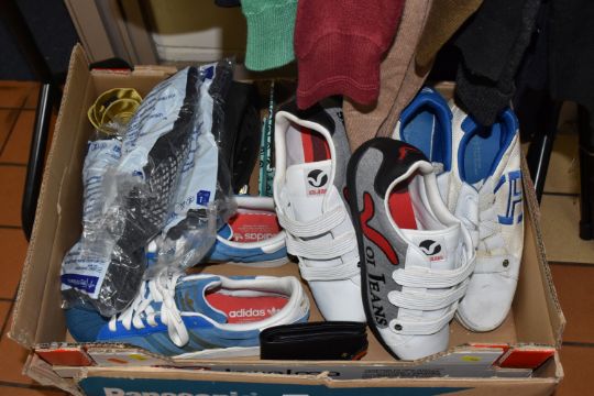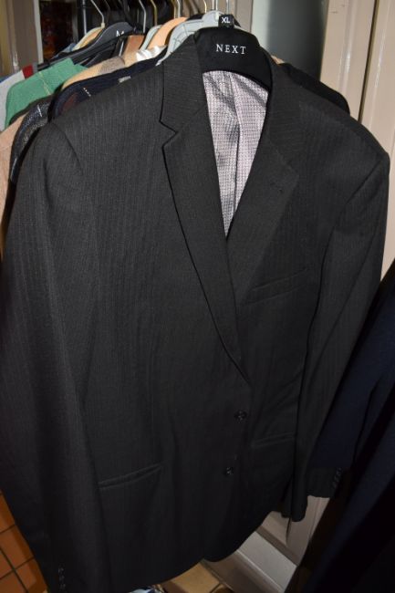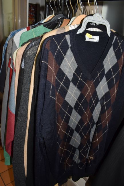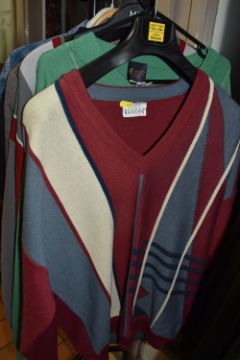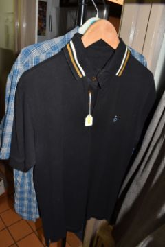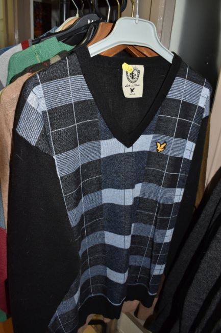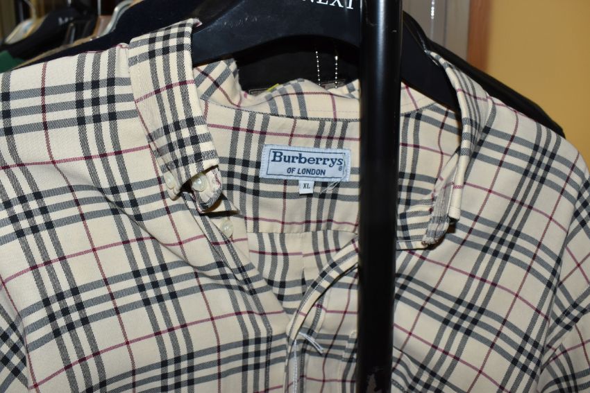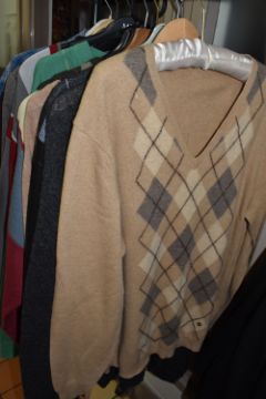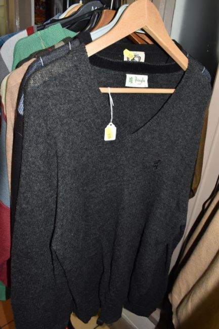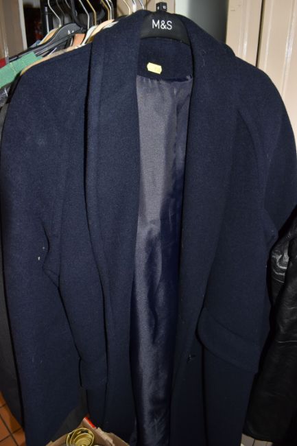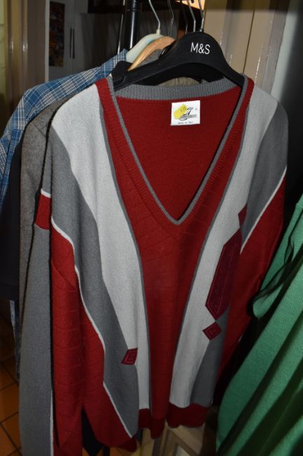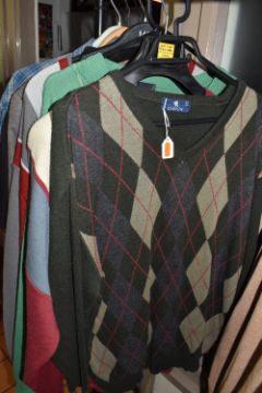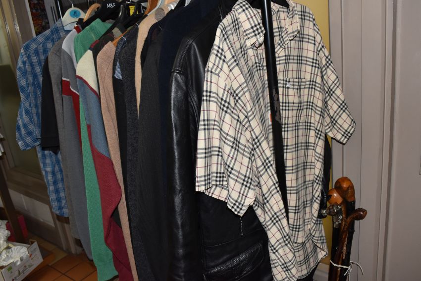 TWO BOXES AND LOOSE MEN'S CLOTHES AND ACCESSORIES, to include knitwear, shirts, trousers, jackets, shoes, four walking sticks, etc, brands to include Burberrys (a shirt, size XL), Vivienne Westwood, Marks and Spencer, Gabicci, Pierre Sangan, Carson, Lyle and Scott, Pringle, Taylor & Wright, Armani Jeans, etc, sizes M-XL, shoe size 10, PLEASE NOTE: RAIL IS FOR DISPLAY PURPOSES ONLY, AND IS NOT INCLUDED IN THE SALE (2 boxes + loose) (sd)