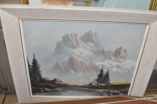 NINE 20TH CENTURY LANDSCAPE OIL PAINTINGS, comprising two Canadian landscapes signed Postell, one also with the location Laurentian P.Q bottom left, largest approximately 39cm x 52cm, a coastal sunset landscape signed Graham Bradley bottom left, personal inscription dated Toronto 1966 verso, oil on board, an unsigned landscape with a road cutting through a landscape, dated Toronto 1967 verso, oil on board, a Harvest landscape signed A. W. Ferris bottom right, there is a further landscape painting by the same artist verso dated 1961 titled From Kilworth Bridge (Ontario), a landscape with trees and a path signed Oriel Cockram signed and dated 1967, an indistinctly signed landscape depicting a white house overlooking a lake, an indistinctly signed landscape with trees and mountains and a townscape with figures and a horse and cart signed A.Vinci