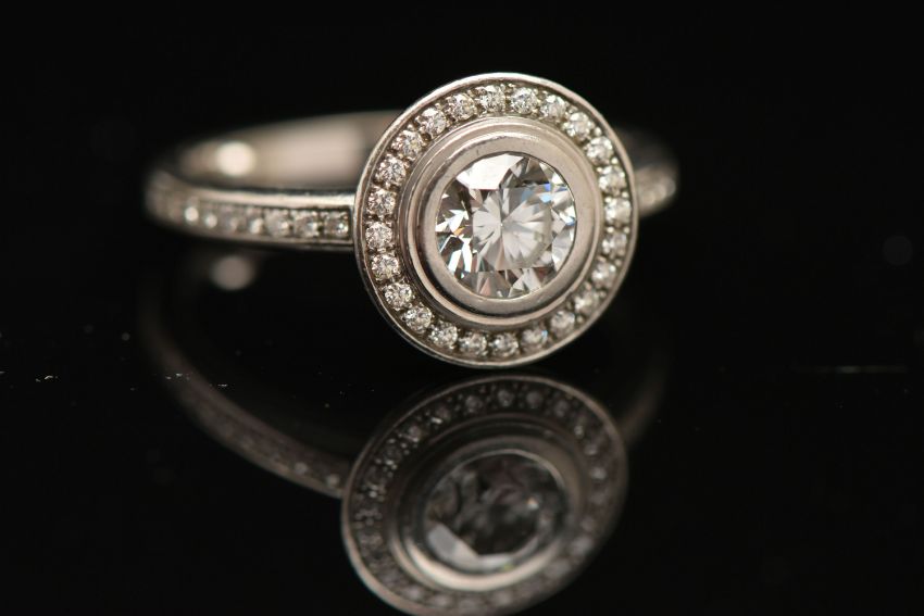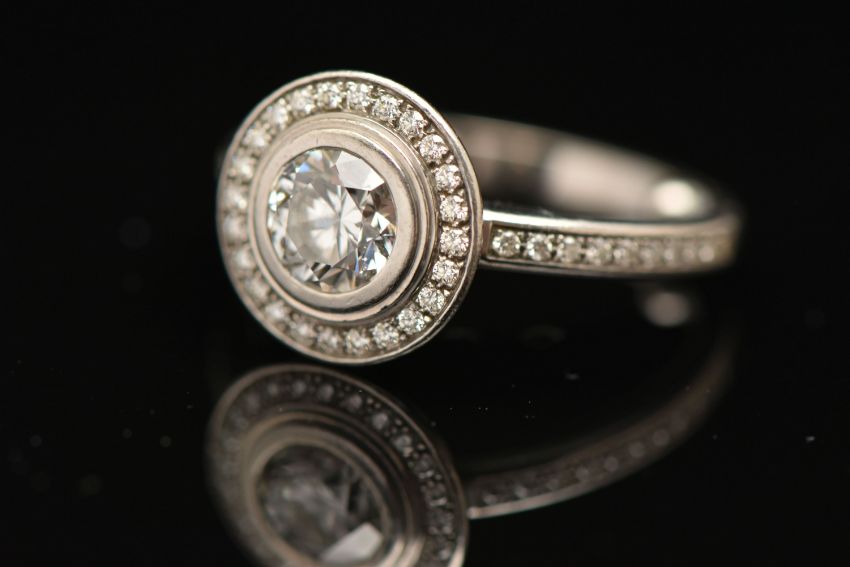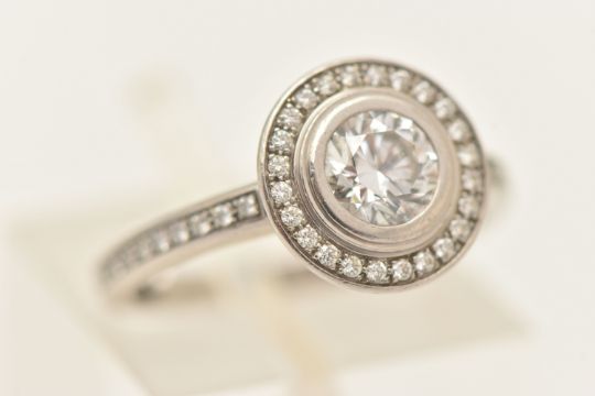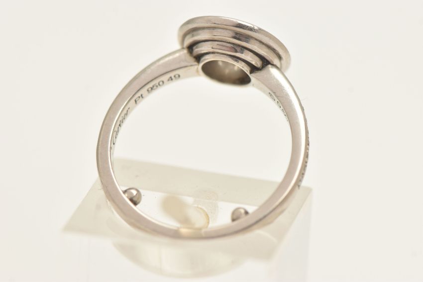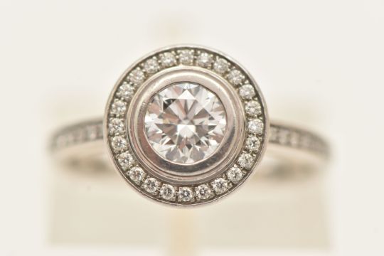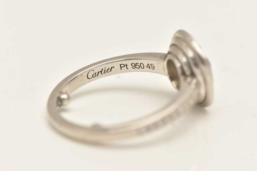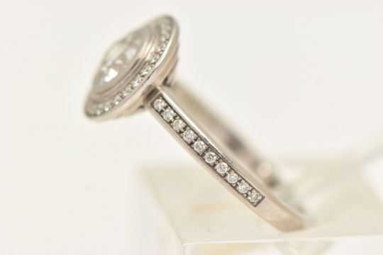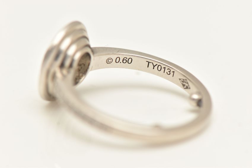 A BOXED 'CARTIER' D'AMORE PLATINUM DIAMOND HALO RING, together with GIA diamond report, collet set with a round brilliant cut diamond, stated diamond carat weight 0.60ct, stated colour G, clarity VVS1, cut grade excellent, measuring 5.39mm x 5.43mm x 3.36mm, laser inscription number GIA 2121819276, within a halo of round brilliant cut diamonds and round brilliant cut diamond set shoulders, signed 'Cartier Pt 950 49', stamped diamond weight 0.60, TY0131, band fitted with two sizing beads, ring size F, approximate gross weight 5.8 grams, together with box, certificate in wallet (condition report: overall condition very good)