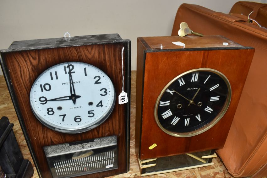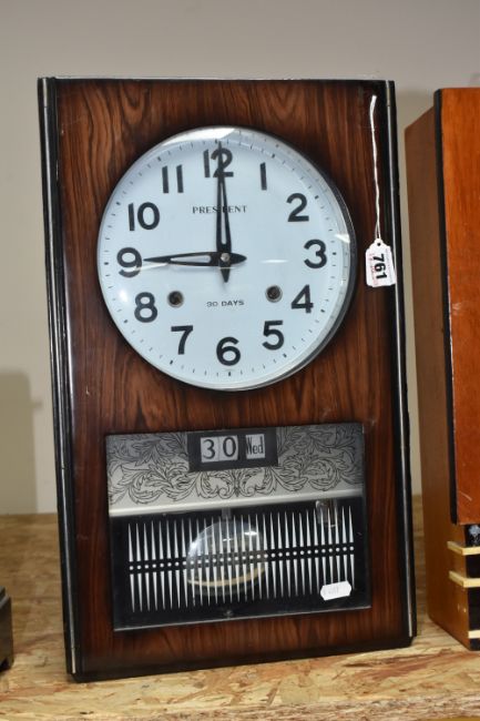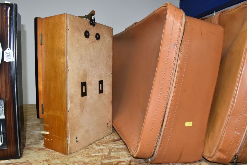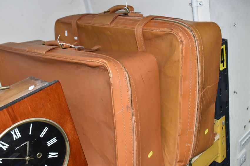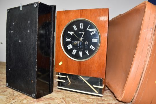 TWO CLOCKS AND TWO SUITCASES comprising a Jantar vintage wall clock, marked Made in USSR, with pendulum mechanism, height 45cm x width 28cm (some nibbles to the glass, loose plastic embellishment), a vintage President 30 Day wall clock with a date display, marked made in Korea, height 46cm x width 28cm, and two large leather suitcases (both with signs of wear, a/f (4) (Condition Report: itemised conditions above)